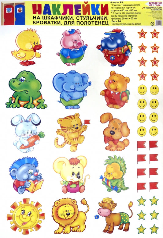 Наклейки для шкафчиков, кроваток, стульчиков и поощрения №2 (для детей от 1 года). В комплекте 4 листа А3 + вкладка А4 "Список детей" на 30 человек