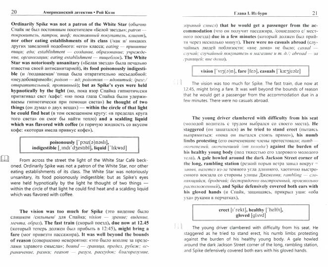 Детективу Кэрроллу предстоит нелегкая задача - раскрыть убийство незнакомца, чье тело таинственным образом оказалось найденным в салоне ночного такси...Криминальный роман признанного мастера остросюжетного жанра американца Роя Коэна (1891-1959) адаптирован в настоящем издании по методу Ильи Франка: снабжен дословным переводом на русский язык и необходимым лексико-грамматическим комментарием (без упрощения текста оригинала).Уникальность метода заключается в том, что запоминание слов и выражений происходит за счет их повторяемости, без заучивания и необходимости использовать словарь. Кроме того, читатель привыкает к логике английского языка, начинает его "чувствовать".Пособие способствует эффективному освоению языка, может служить дополнением к учебной программе.Для широкого круга лиц, изучающих английский язык и интересующихся культурой англоязычных стран.Пособие подготовила Ольга Ламонова.