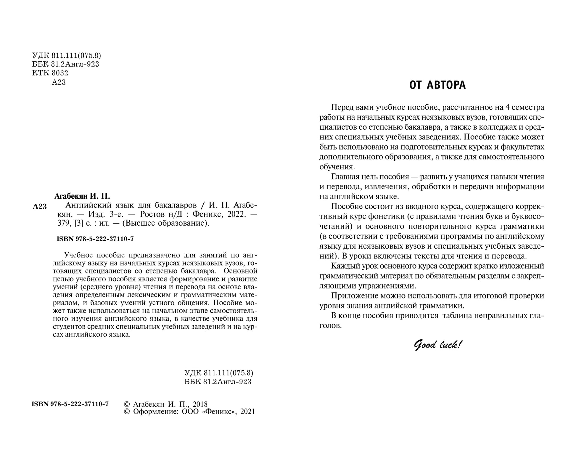 Учебное пособие предназначено для занятий по английскому языку на начальных курсах неязыковых вузов, готовящих специалистов со степенью бакалавра. Основной целью учебного пособия является формирование и развитие умений (среднего уровня) чтения и перевода на основе владения определенным лексическим и грамматическим материалом, и базовых умений устного общения. Пособие может также использоваться на начальном этапе самостоятельного изучения английского языка в качестве учебника для студентов средних специальных учебных заведений и на курсах английского языка.3-е издание.