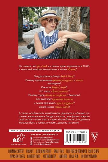 Вы знаете, что five o'clock на самом деле начинается в 16.00, а типичный завтрак англичанина - это не овсянка? Откуда взялось блюдо Fish & Chips? Почему традиционные английские пудинги и пироги несладкие? Как есть Жабу-в-норке? Что такое "время пиммса"? Почему город стоит на сэндвичах с беконом? Как выглядит купальная машина и зачем принимать душ с друзьями? Зачем нужно столько пабов? А также особенности менталитета, диалекта и обычаев англичан, национальные блюда и напитки, все фишки лондонской жизни - всем этим в своем блоге @london_inn делится Наталья Лэнг, а теперь и с вами, дорогие читатели! Пять причин купить 1.Наталья Лэнг — популярный блогер (более 315 тыс. подписчиков в Инстаграм), уже несколько лет проживающая в Лондоне. 2.Книга рассказывает о стране изнутри, все описанное — личный опыт автора и ее наблюдения. 3.Интересный, живой язык, не перегруженный текст и легкий юмор. 4.Множество фотографий из личного блога Натальи и красочных иллюстраций Андрея Попова. 5.Книга развенчивает сложившиеся стереотипы об Англии и ее жителях.