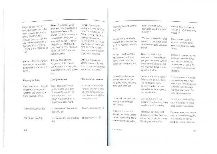 Этот инновационный трехъязычный разговорник включил в себя все аспекты ведения успешных переговоров, заключение сделок, традиции и базовый курс выражений, применяемых в бизнесе. Книга содержит отдельные главы, посвященные проведению бесед, персональной языковой тренировке, словарь, фоновую информацию, глоссарий.