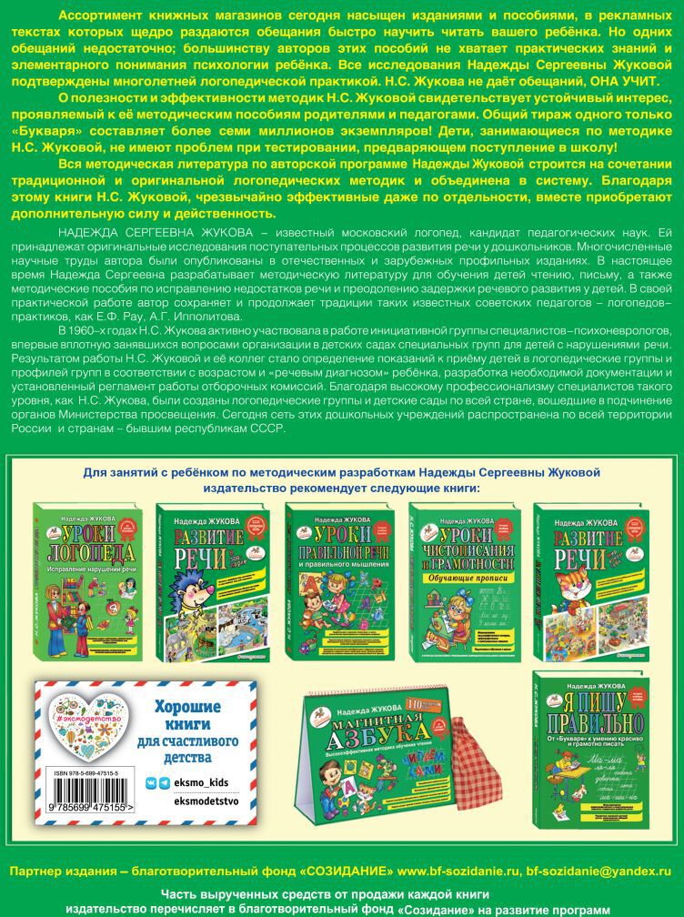 При составлении Букваря автор использовал свой 30-летний опыт работы логопеда, что впервые позволило сочетать обучение грамоте с предупреждением ошибок на письме, возникающих в школьном возрасте. Букварь основан на традиционном подходе к обучению чтению на русском языке, дополняя традиционный подход оригинальным способом обучения ребенка осознанию буквосочетания как цельного графического элемента - слога в качестве единицы чтения (в дальнейшем письма). Букварь не имеет развлекательного или занимательного характера, его задача - обеспечить ребенку наибыстрейшее овладение техникой чтения, что должно доставить детям радость и удовольствие в награду за труд. Надеемся, что наши дети, овладев без особых затруднений чтением, возьмут в руки книгу как орудие культуры и источник знаний.Рекомендован Министерством общего и профессионального образования Российской Федерации.Более 10 лет "Букварь" Н.С. Жуковой входит в ТОП-50 розничных продаж, общий тираж "Букваря" составляет более 5 млн экземпляров. Автор классического букваря - логопед с 30-летним стажем работы, кандидат педагогических наук. Ей принадлежат оригинальные исследования поступательных процессов развития речи у дошкольников. "Букварь" - пример классического учебного пособия, по которому успешно выучились уже три поколения детей. Пять причин купить 1Надежда Жукова - логопед с 30-летним стажем работы, кандидат педагогических наук. 2"Букварь" – это классическое учебное пособие, по которому успешно выучились уже три поколения детей. 3Когда логопеды и учителя рекомендуют заниматься «по Букварю», они имеют в виду именно «Букварь» Надежды Жуковой! 4Более 10 лет "Букварь" Н.С. Жуковой входит в ТОП-100 розничных продаж, общий его тираж составляет более 7 млн экземпляров. 5На обложке наших книг размещен знак благотворительного фонда «Созидание». Это означает, что часть средств от продаж «Букваря» передается на лечение детей.