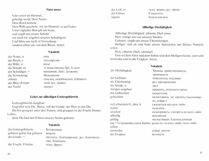 Учебное пособие предназначено для введения в изучение аспекта "Богословский перевод" и адресовано в первую очередь студентам III и IV семестров бакалавриата богословского факультета ПСТГУ, также может быть интересным и полезным и для других лиц, изучающих немецкий язык в широком аспекте.Данное пособие структурно состоит из трех частей. В первой части для изучения предлагаются часто используемые молитвы и хорошо известные библейские тексты, а также большой словарь церковных терминов. Вторая часть посвящена общехристианскому святому Бонифацию и его миссионерской деятельности по христианизации Германии. Третья часть носит характер приложения и предлагает три блока текстов для факультативного и дополнительного изучения: Истории из Ветхого Завета, Притчи и Топонимы в Новом Завете.Составитель: Кирпичева С.А.