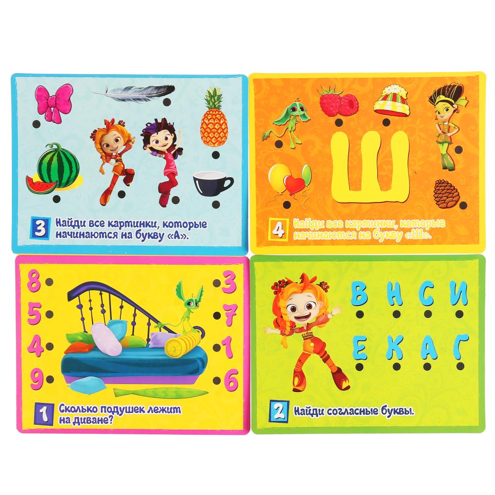 В яркой игре на 6-ти двусторонних карточках более 100 красочных картинок с 80-ю обучающими заданиями! На карточках изображены буквы, цифры, разные предметы и любимые персонажи детей из мультфильма «Сказочный патруль». Световой сигнал всегда подскажет правильный ответ! Вы можете задавать ребёнку дополнительные вопросы. Например, «Сколько всего букв на карточке?», «Что нарисовано справа от Тучки» и т. д. Желаем успешного обучения!