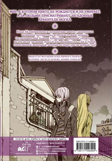 Мир, в котором никто не рождается и не умирает, а за людьми присматривают загадочные Хранители Могил. Юная Ай отправляется в путешествие вместе с загадочным человеком, которого она встретила в своей деревне. Он называет себя Хампни Хамбертом, "игрушкой-людоедом", но кто же он на самом деле? И что связывает его с Ай и Ханой, таинственной женщиной, которую он ищет уже не первый год?Манга по мотивам популярного ранобэ, которое легло в основу аниме-сериала. Пять причин купить 1Продолжение популярной манги! 2Загадочная история о мире, в котором никто не рождается и не умирает. 3Экранизированный бестселлер! Манга легла в основу известного аниме. 4Удостоена гран-при конкурса журнала Fujimi Shobo! 5Эта книга удивляет своей задумкой и поражает своим воплощением.