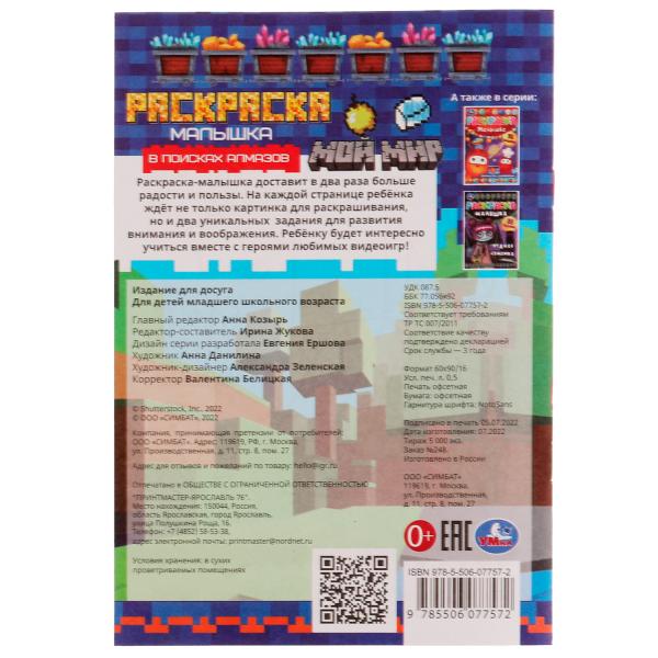 Книга "В поисках алмазов. Раскраска Малышка 16 заданий. 145х210 мм. Скрепка. 8 стр. Умка в кор.100шт". Издательство: Умка. Количество страниц: 8.