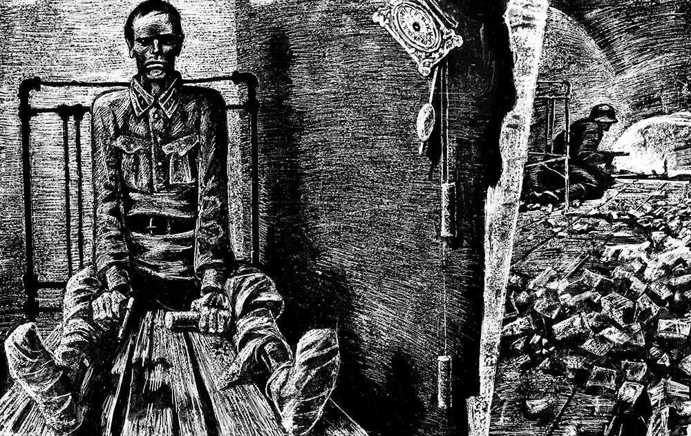 «Он шёл строго и прямо, ничего не видя… И все стояли на своих местах, и он шёл один, с трудом переставляя распухшие, обмороженные ноги. И вдруг немецкий лейтенант звонко и напряжённо, как на параде, выкрикнул команду, и солдаты, щёлкнув каблуками, чётко вскинули оружие „на караул“. И немецкий генерал, чуть помедлив, поднёс руку к фуражке. А он, качаясь, медленно шёл сквозь строй врагов, отдававших ему сейчас высшие воинские почести...» — последний защитник так и не покорившейся крепости, в списках не значившийся.