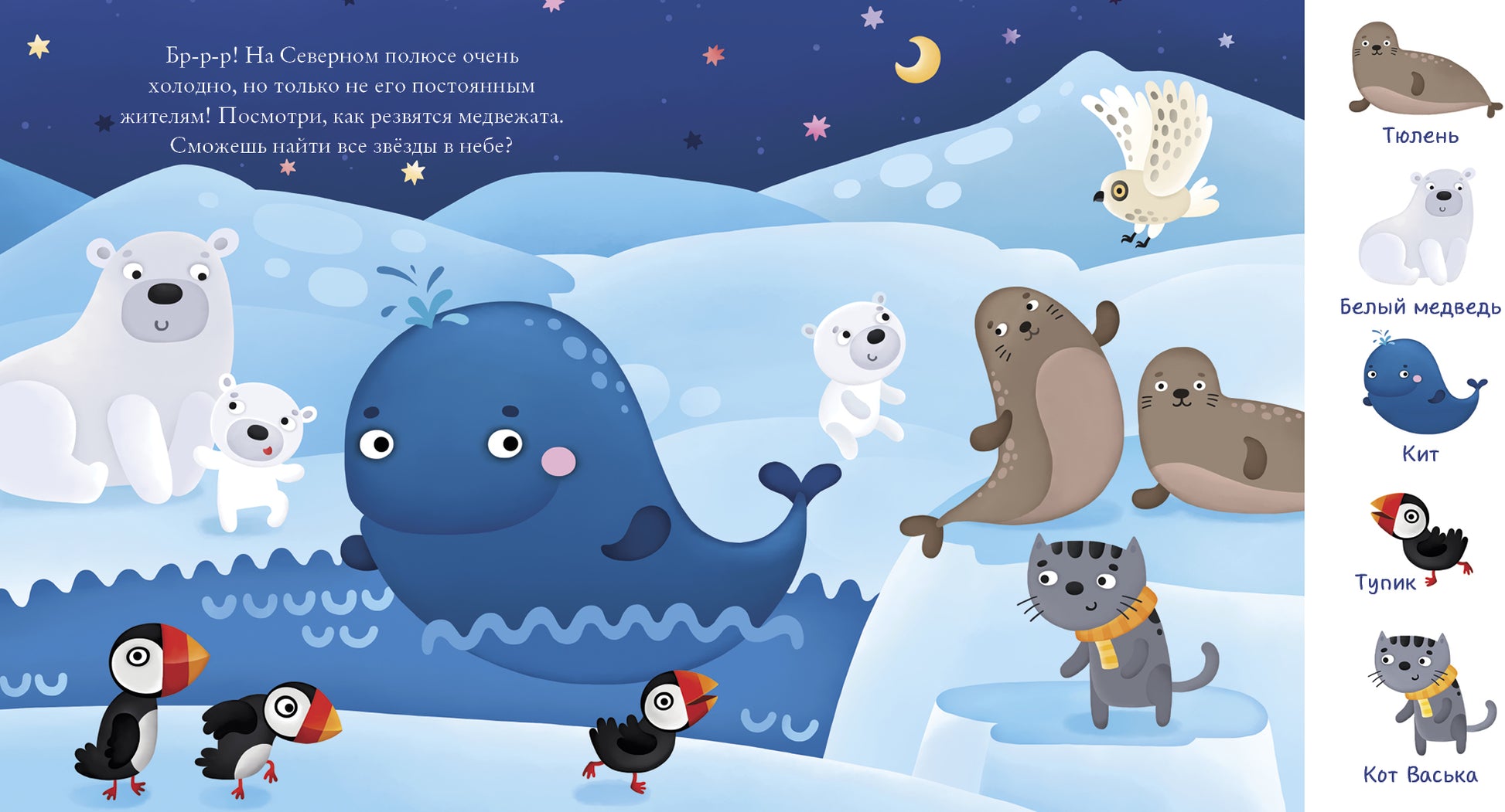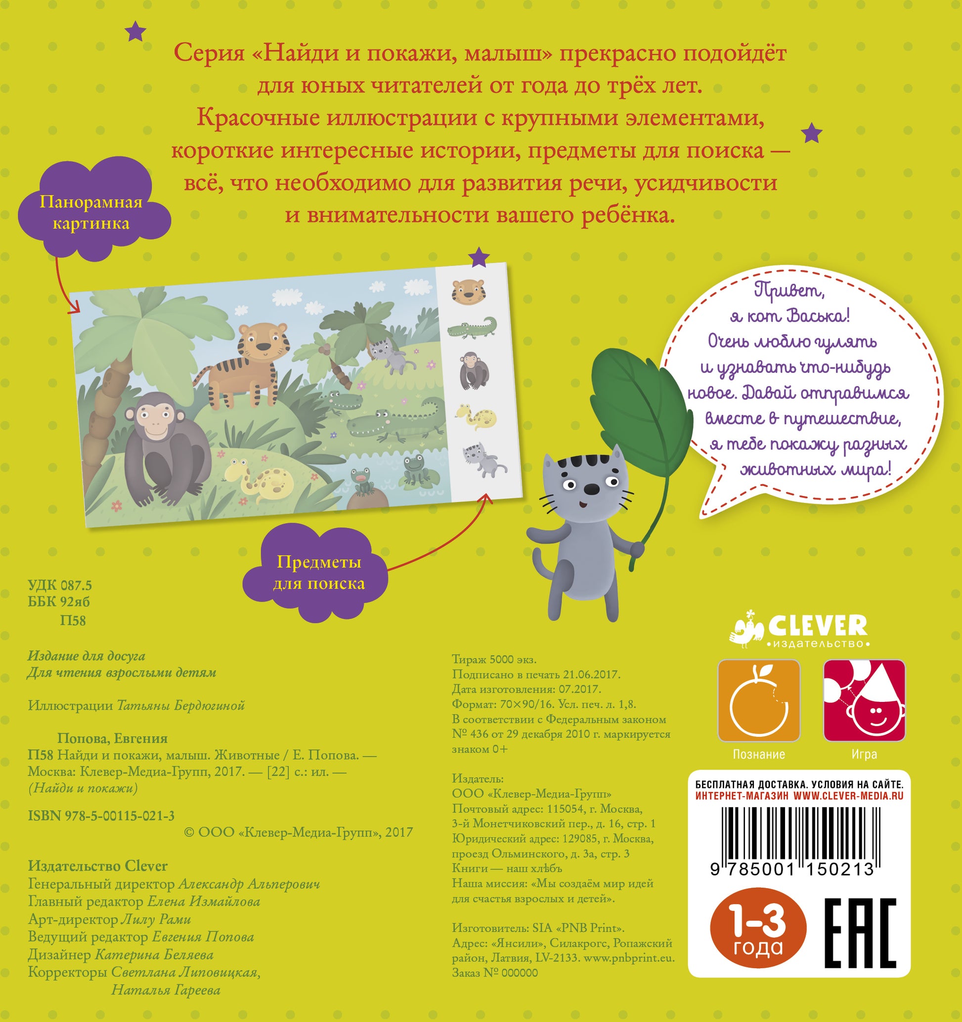 3 фишки:- Любимая игра "Найди и покажи" для самых маленьких- Играем с мамой, развиваем речь, внимание, логику- В серии продано более 440 000 экземпляров Описание книгиПока ребенок рассматривает картинки и ищет предметы, он будет знакомиться с окружающим миром и узнает много интересного о зверюшках со всего мира.Красочные иллюстрации с крупными элементами, короткие интересные истории, игра "Найди и покажи" - все, что необходимо для развития речи, усидчивости и внимательности вашего ребенка. Рассматривайте вместе картинки, ищите предметы, вынесенные на край страницы, а шустрый кот Васька не даст заскучать, он будет сопровождать вас на протяжении всего путешествия.Книжку приятно брать в руки: странички плотные, а иллюстрации красочные и яркие. Вы и сами будете с удовольствием рассматривать книгу. Ведь самое важное - ваши совместные занятия с малышом.Лайфхак для родителей • Листайте книжку вместе и спрашивайте у ребенка, какие предметы ему знакомы, что как называется, где он видел то, что нарисовано на картинке• Расскажите малышу истории, связанные с предметами на картинках• Учите новые слова, цвета и формы• Удобный формат позволяет брать книжку в дорогу и на прогулку• Обязательно хвалите за старанияЧто развиваем?- Внимание- Память- Усидчивость- Расширяем словарный запас