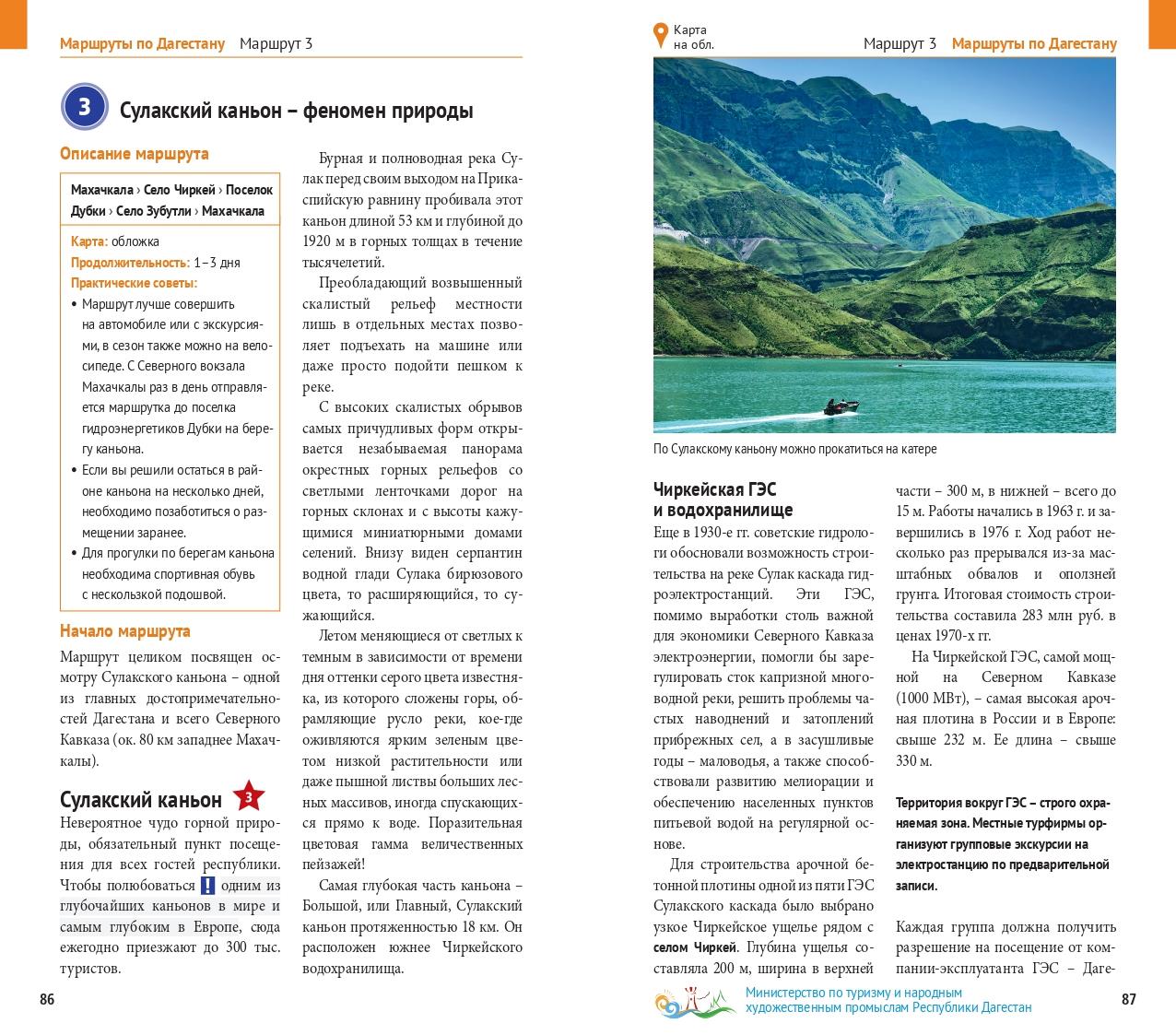 В Дагестане есть, практически, все условия для развития туризма: песчаный берег Каспия (солёная лечебная вода, мелкий песок, 200 солнечных дней в году), высоченные живописные горы, бурлящие реки и водопады, равнины и степи. На его территории находится более восьми тысяч культурных и исторических памятников, охраняемых государством. Все, кто хоть раз посетил эту самую южную республику России, получили незабываемое впечатление от её красоты и богатства древних традиций. В путеводитель включены двенадцать самых интересных брендовых маршрутов, разработанных лучшими специалистами в области туризма Республики, отобраны уникальные фотографии, позволяющие почувствовать неповторимый колорит республики. Схемы маршрутов помогут Вам с лёгкостью ориентироваться на местности. Кроме того, в гиде размещена практическая информации – полезные ссылки, адреса музеев, ресторанов, гостиниц, расписание работы музеев и маршруты общественного транспорта, а также краткая историческая справка и не только. Испокон веков Дагестан притягивал к себе бесчисленное количество путешественников, художников, поэтов и писателей. В Дагестане более 6000 памятников истории, среди которых архитектурный комплекс цитадель Нарын-кала, включенный в Cписок Всемирного наследия ЮНЕСКО, самый высокий бархан в Евразии Сарыкум, самый глубокий каньон в Европе – Сулакский каньон и др. В Южном Дагестане расположен уникальный горный комплекс Шалбуздаг – Базардюзи – Ярыдаг, высота которого более 4000 м над у. м., представляющий большой интерес для альпинистов и любителей экстрима. Побережье Каспия, его золотые пески притягивают любителей пляжного отдыха. Помимо разнообразных предгорных и горных ландшафтов, а также теплого Каспийского моря, территория Дагестана выгодно отличается своими климатическими условиями и ценными минеральными водами, лечебными грязями. Для отдыха с детьми или тех, кто предпочитает пляжный отдых, можно великолепно провести время на песчаных пляжах Каспия с пологим спуском в море. Климат республики предоставляет великолепную возможность для круглогодичного активного отдыха. Это винд- и кайтсерфинг, катание на водных лыжах и бананах, катерах и катамаранах, сплавы по рекам, охота, рыбалка, ну и, конечно, походы в горы, при этом Вы можете выбрать маршрут с уровнем сложности, подходящим именно Вам. В Дагестане есть и свой круглогодичный горнолыжный курорт с 10-ти километровой трассой. Гостям Дагестана предоставляется замечательная возможность совместить активный отдых в экологически чистой среде с интересным культурным досугом. И наконец в любое время года гостей Дагестана ждет настоящее радушное кавказское гостеприимство и богатые столы с национальными блюдами только из натуральных, экологически чистых продуктов. Посетите и откройте для себя Дагестан с «Полиглотом»!
