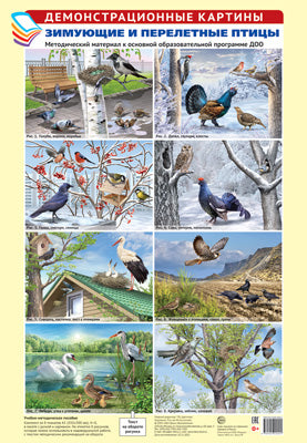 Комплект «Зимующие и перелетные птицы» состоиз из 8 цветных демонстрационных картин формата А3 и этикетки, на обороте которой приводятся беседы, игры, занятия и упражнения с детьми по каждой картине. Дети познакомятся с 24 зимующими и перелетными птицами, узнают об их образе жизни, внешних признаках, особенностях поведения и питания.