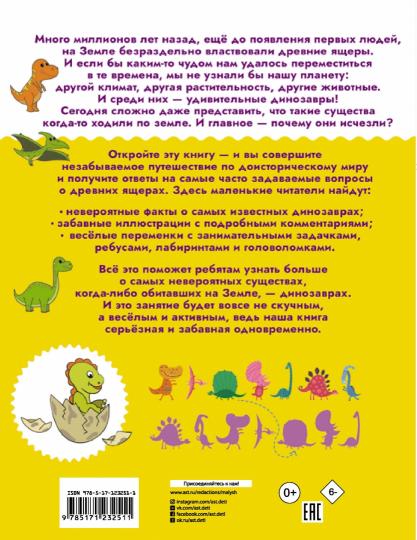 Эта книга даст детям уникальную возможность познакомиться с доисторическими животными, вымершими много лет назад. На её страницах ребята узнают всё о самых известных динозаврах , их образе жизни, питании и местах обитания, найдут ответы на свои самые часто задаваемые вопросы о древних ящерах и поймут, насколько сильными, но порой уязвимыми были эти величественные животные. Знакомство с ними будет интересным и увлекательным — ведь здесь приведено множество занимательных заданий, ребусов и головоломок, которые помогут ребёнку в игровой форме закрепить материал. Изучение любой темы может быть весёлым и нескучным, и книга "Динозавры" именно такая — она серьёзная и забавная одновременно.Для дошкольного возраста.