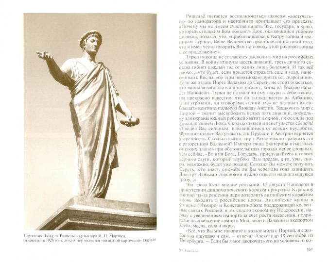 Арман Эммануэль дю Плесси, 5 - й герцог де Ришелье (1766-1822), получил в России имя Эммануил Осипович и был запечатлен в бронзе как Дюк. Прапраправнучатый племянник знаменитого кардинала и внук маршала вынужден был покинуть родину во время революционных потрясений, добровольцем участвовал в кровопролитном штурме турецкой крепости Измаил, 24 года верно служил "приемному отечеству" - России, на посту генерал-губернатора боролся с косностью, невежеством и мздоимством, чтобы на месте захудалого поселка вырос цветущий город Одесса. Возвратившись в разоренную Францию, он в качестве главы правительства вел изматывающие кабинетные сражения за независимость и благосостояние страны, но не превратился в царедворца и остался "чужим среди своих". Его безграничная способность любить была вынуждена ютиться на краешке мечты о личном счастье. Российский император Александр I назвал Дюка единственным другом, говорившим ему истину, а английский герцог Веллингтон считал, что "слово Ришелье стоит трактата". Он с честью носил родовое имя и занял достойное место в истории Франции, России и Украины.