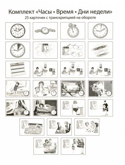 Комплект «Часы, время, дни недели» удобно составлен для ребенка: ему достаточно рассмотреть цветные рисунки, чтобы запомнить написание связанных с ними слов. Это поможет развить зрительное восприятие и сформировать ассоциативную связь между рисунком и его названием на английском языке.