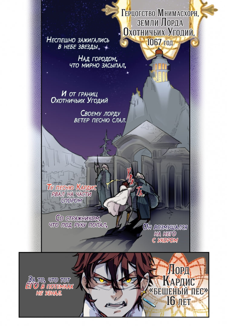 (12+) Стихотворный сказ о гордом Лорде Кардисе “Бешеном Псе” и о страдающем от него окружении. В тихом уголке Лукоморья, в Мнимасхорне, занятная компания, скрывшись от глаз своего несколько неуравновешенного Лорда, развернула карточную игру. Среди игроков оказалась и прекрасная иностранка Эра, что попала в угодья Лорда не по своей воле. За игрой разговоры зашли в обсуждение Лорда. И как выяснилось, многие из присутствующих оказались здесь также не по собственному желанию. Настало время узнать историю одного из бедолаг – Хриза. С чего все началось, и почему он до сих пор не сбежал?
