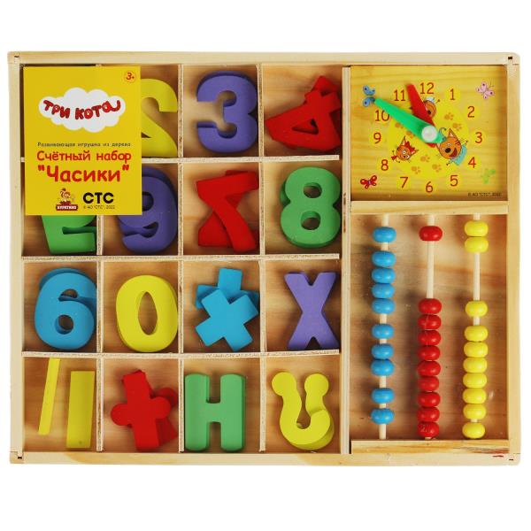 Игрушка деревянная Три Кота счетный материал с часами, терм. пакет Буратино в кор.120шт