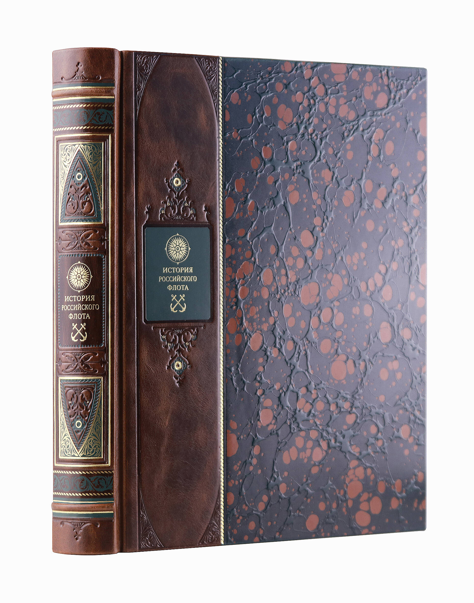 История российского флота. Книга в коллекционном переплете из двух видов кожи с рисунком мраморной бумаги и с изящным тиснением в стиле 19 века