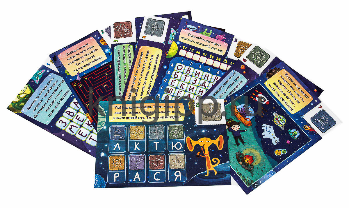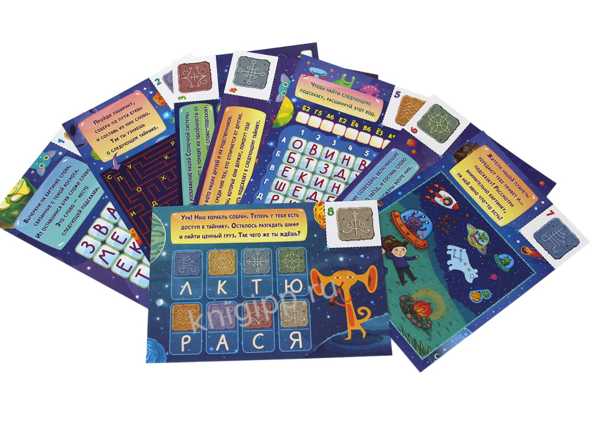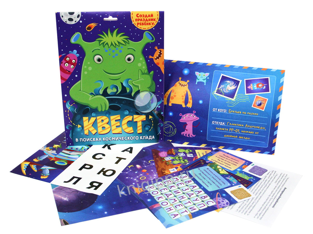 Мечтаете наполнить волшебством детский праздник? Хотите, чтобы ребёнок надолго запомнил ваш подарок? Тогда вы нашли то, что искали! Превратите простое поздравление в увлекательный квест! Спрячьте подарок и позвольте малышу отправиться на поиски своего сокровища. Ему предстоит выполнить задания, расшифровать подсказки, восстановить космический корабль и найти тайник с ценным грузом. Поверь в чудеса!В комплект входят: конверт, карта, вкладыш с наклейками, письмо от инопланетян, инструкция и 8 листов с заданиями.Для детей старше 3-х лет.Сделано в России.