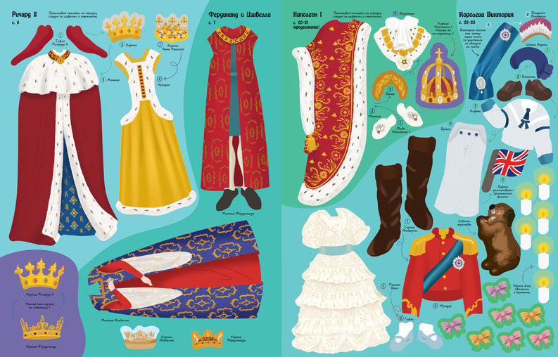 Узнай всё о королевских нарядах!Шикарные мантии, шёлковые платья с пышными юбками, сияющие короны, драгоценные украшения и другие предметы роскоши ты найдёшь на наклейках в этой книжке.Читаем и играем! Развиваем внимание, воображение, мелкую моторику и художественный вкус. Пять причин купить 1Книга станет настоящей находкой для ребенка любого возраста, обеспечит его полезным и интересным занятием, а родителей - парой часов свободного времени. 2«Супернаклейки» не только развивают мелкую моторику, но также учат усидчивости, аккуратности и концентрации на монотонном занятии. 3Альбом расширяет кругозор: на каждом новом развороте маленькие читатели встретят реальных исторических личностей и краткое описание времени, в которое они правили. 4Ко всем картинкам, которые необходимо украсить, приложена небольшая инструкция - она помогает не запутаться в нарядах и в правильном порядке расположить наклейки. 5Наклейки многоразовые, поэтому ребенок точно не расстроится, если вдруг случайно допустит ошибку.