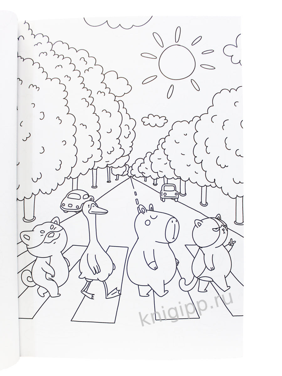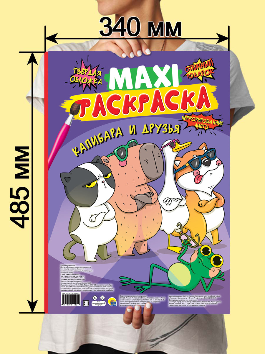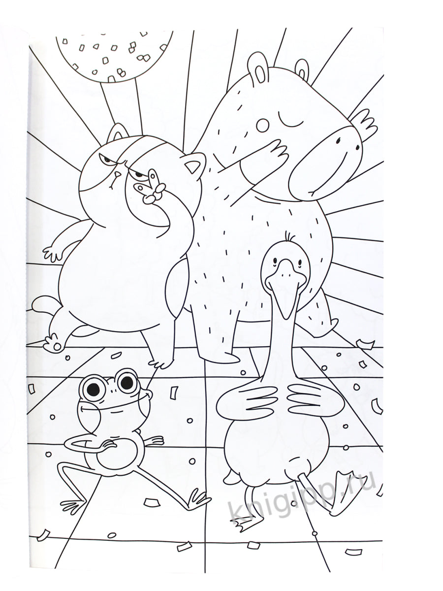 Капибара и друзья. Макси -раскраска. Встречайте самых популярных героев наших дней! Милая капибара, грустный кот, забавный пес, важный гусь и заводная лягушка — теперь и в нашей MAXI-раскраске. Размер имеет значение: юным художникам проще раскрашивать крупные элементы! Кроме того, благодаря твердой основе удобно творить где угодно, а еще легко отделить рисунок, аккуратно вырвав лист по линии перфорации.