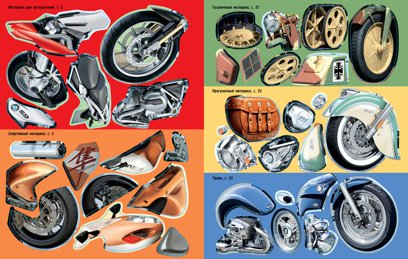 В этой книжке ты найдёшь самые разные Мотоциклы - от ретро-мопеда до суперсовременного гоночного байка! Собери и дополни мотоциклы с помощью наклеек.Читаем и играем!Развиваем внимание, воображение, мелкую моторику и художественный вкус.Играя с книгами из серии "Супернаклейки", ребенок развивает мелкую моторику, аккуратность и чувство прекрасного. Добрые и яркие картинки интересно разглядывать, а небольшие познавательные истории помогают расширять кругозор маленьких читателей.Книги яркие и качественные: у них плотные страницы, глянцевая бумага и приятная обложка. Ребенок сможет играть с книжкой в течение пяти часов, а благодаря удобному формату взять любимую историю с собой в поездку. "Супернаклейки" точно понравятся и детям, и их родителям! Пять причин купить 1Перед вами настоящая находка для маленьких любителей творчества, которые устали от привычных раскрасок и ищут новое увлекательное занятие. 2Книга расскажет все самое интересное о мотоциклах и даст читателям возможность самостоятельно оформить каждую из представленных моделей. 3Огромное количество ярких наклеек сопровождается краткой инструкцией к каждому рисунку, таким образом не позволяя запутаться в творческом процессе. 4Книга развивает мелкую моторику, учит усидчивости, внимательности и концентрации, а еще отлично работает в качестве антистресса. 5Альбом однозначно станет оригинальным подарком, а когда ребенок дойдет до конца, то сможет ознакомиться с другими книгами из серии «Супернаклейки».