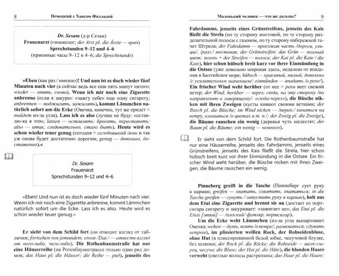 Иоганнес и Эмма - молодая пара, ожидающая рождения ребенка, жизнь которой наполнена бесконечными попытками свести концы с концами и противостоять сыплющимся со всех сторон невзгодам. Единственное, что поддерживает их в этой постоянной борьбе за существование, - любовь друг к другу и надежда, что когда-нибудь все обязательно изменится. А между тем на дворе - начало 30-х, и в воздухе явственно ощущается неотвратимость надвигающихся перемен...Благодаря простому языку и затронутым проблемам, близким и понятным обычному читателю, "Маленький человек...", мгновенно получив популярность после выхода в свет, и в наши дни по-прежнему сохраняет любовь аудитории. В предлагаемом издании роман адаптирован по методу Ильи Франка: снабжен дословным переводом на русский язык и необходимым лексикограмматическим комментарием. Запоминание слов и выражений при этом происходит за счет их повторяемости, без заучивания и необходимости использовать словарь. Кроме того, читатель привыкает к логике немецкого языка, начинает его "чувствовать".Издание адресовано широкому кругу лиц, изучающих немецкий язык и интересующихся культурой Германии.В рамках серии текст романа представлен в сокращенной редакции.