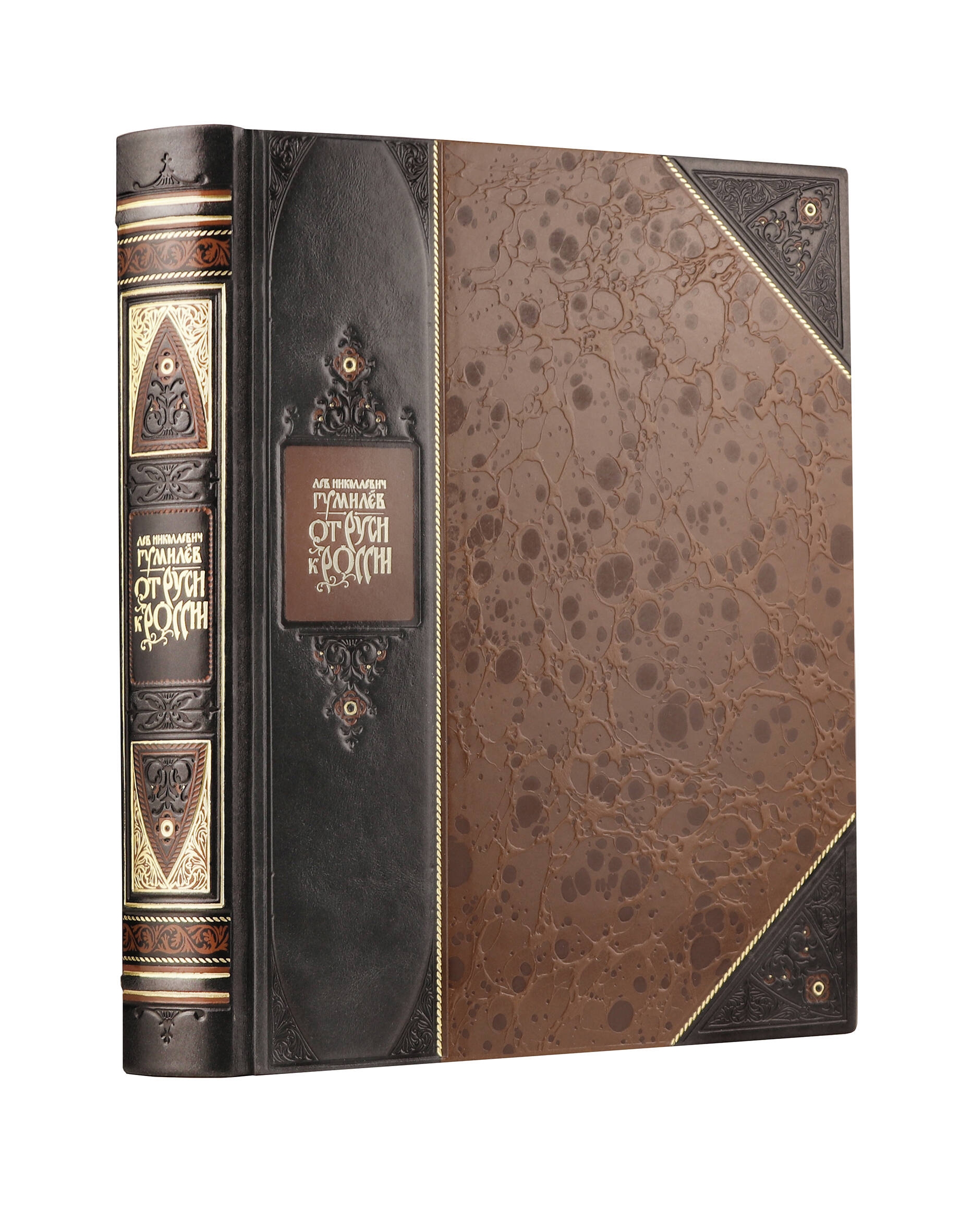 От Руси к России Льва Гумилева". Книга в коллекционном переплете из двух видов кожи с рисунком мраморной бумаги и с изящным тиснением в стиле 19 века