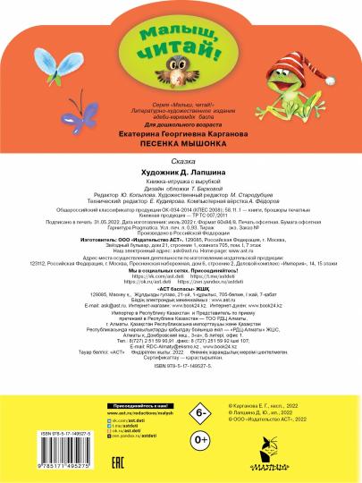 Один Мышонок любил петь песенки и играть на гитаре. Да так задорно у него это получалось! Одно плохо — не любил Мышонок трудиться. Все работают, а он знай себе песни поёт. И решили тогда Мышонку преподать урок, ведь всем известно, что делу время, а потехе час!Знаменитая сказка Екатерины Каргановой (1922–2017) «Песенка Мышонка» наверняка всем известна ещё и по одноимённому мультфильму. Бесхитростные и доброжелательные персонажи её сказок полюбились не только детям, но и родителям. В нашу книгу вошла сказка «Песенка Мышонка» с рисунками талантливой художницы Дианы Лапшиной.Для дошкольного возраста.Всю жизнь Екатерина Георгиевна Карганова (1922—2017) писала для детей. Она сочиняла песенки, придумывала загадки и игровые задания, писала сказки. По многим её произведениям были сняты мультфильмы «Песенка Мышонка», «Как Ослик счастье искал», «Жёлтик» и другие. На протяжении долгого времени Екатерина Карганова заведовала редакцией игровых изданий издательства «Малыш». Главные герои её произведений поросята, цыплята, щенки, котята — ведут себя как и все дети. Они бесхитростные, они учатся дружить, иногда обижаются и злятся и, конечно же, искренне умеют радоваться приятным событиям. И если вдруг они ведут себя неправильно или попадаютв сложные ситуации, обязательно найдётся тот, кто выручит и поддержит. Именно за эту простоту изложения Екатерина Карганова так полюбилась детям и взрослым!