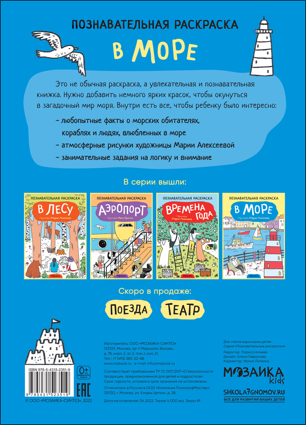 В море (Познавательные раскраски) В раскраске «В море» из серии «Познавательные раскраски» есть все, чтобы ребенку было интересно: любопытные факты о морских обитателях, кораблях и людях, влюбленных в море; занимательные задания на развитие логики и внимания; атмосферные иллюстрации, погружающие в загадочный мир моря. Это не обычная раскраска, а настоящая книга — увлекательная и развивающая. Раскрашивая картинки страничка за страничкой, ребенок откроет для себя много нового и интересного. На каждой полосе иллюстрации сопровождают поясняющие тексты,...