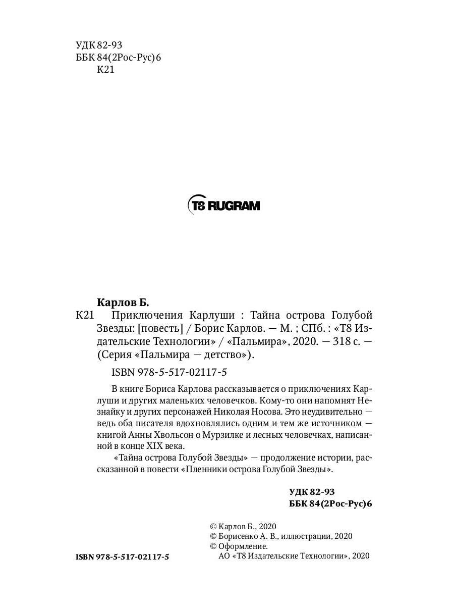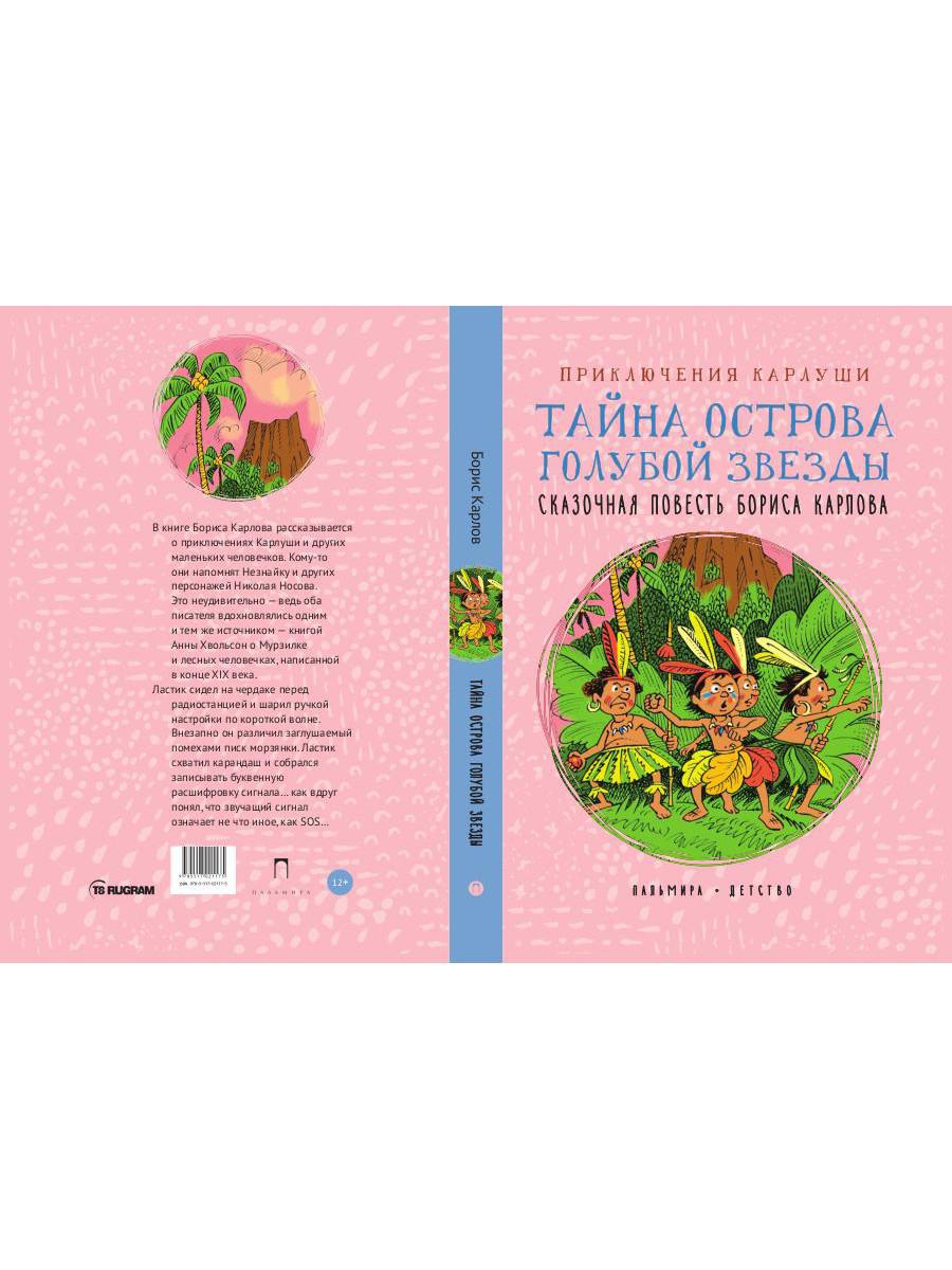 Автор: Карлов Борис, «Приключения Карлуши. Тайна острова Голубой Звезды: повесть»: В книге Бориса Карлова рассказывается о приключениях Карлуши и других маленьких человечков. Кому-то они напомнят Незнайку и других персонажей Николая Носова. Это неудивительно — ведь оба писателя вдохновлялись одним и тем же источником — книгой Анны Хвольсон о Мурзилке и лесных человечках, написанной в конце XIX века. «Тайна острова Голубой Звезды» — продолжение истории, рассказанной в повести «Пленники острова Голубой Звезды».