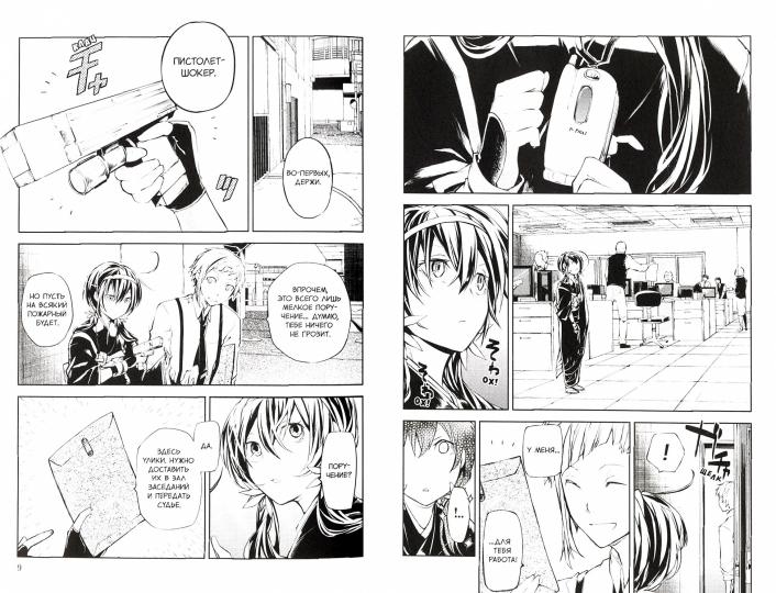 Вместе с Ацуси Накадзимой Кёка Идзуми отправляется на свое первое задание и пробует себя в роли детектива. Они прилагают все усилия, чтобы выполнить поручение, но тут появляется Коё Одзаки - старшая подруга Кёки со времен мафии. Она хочет вернуть Кёку, поэтому в открытую нападает на нее и Ацуси! Тем временем детективное агентство, понимая, что конфликта ни с "Гильдией", ни с мафией не избежать, переносит головной офис на новое место. Под командованием Фукудзавы они готовятся дать отпор, хотя их окружили со всех сторон. Начинается Трехсторонняя битва - организаций и способностей!В книгу вошли 5-й и 6-й тома оригинальной манги, главы 17-24. Здесь продолжается арка "Гильдия". Также добавлен рассказ Кафки Асагири "Пес без души". Пять причин купить 1Крепкий детектив с мировыми заговорами, погонями и правительственными шпионами, но у всех есть сверхспособности, и все это по 2 тома в 1 книге. 2Все персонажи - знаменитые писатели и поэты со всего света: Осаму Дадзай, Тюя Накахара, Марк Твен, Федор Достоевский, Николай Гоголь - только начало списка. 3Если ребенок не любит классику, но фанатеет по аниме и манге, после этой серии он точно начнет читать. 4Есть аниме-адаптация от студии Bones, полнометражные фильмы, театральные постановки. 5В 2014 году манга вошла в Топ-10 изданий, рекомендованных книжными магазинами по всей Японии (по версии Nippon Shuppan Hanbai)