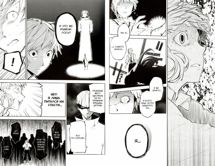Попав под контроль Q, Ацуси больше не верит в себя. Вдобавок он не смог дать отпор Фицджеральду, противостоять способности Олкотт и угодил в плен. Тем временем Q, оказавшись на свободе, нашел себе следующего противника — Лавкрафта, таинственного подмастерья из «Гильдии». Сама «Гильдия» собирается превратить Иокогаму, обетованный край, в море огня, и Ацуси надеется помочь городу...В книгу вошли 7-й и 8-й тома оригинальной манги, главы 25-33. Здесь продолжается арка «Гильдия». Пять причин купить 1Крепкий детектив с мировыми заговорами, погонями и правительственными шпионами, но у всех есть сверхспособности, и все это по 2 тома в 1 книге. 2Все персонажи — знаменитые писатели и поэты со всего света: Осаму Дадзай, Тюя Накахара, Марк Твен, Федор Достоевский, Николай Гоголь — только начало списка. 3Если ребенок не любит классику, но фанатеет по аниме и манге, после этой серии он точно начнет читать. 4Есть аниме-адаптация от студии Bones, полнометражные фильмы, театральные постановки. 5В 2014 году манга вошла в ТОП-10 изданий, рекомендованных книжными магазинами по всей Японии (по версии Nippon Shuppan Hanbai).