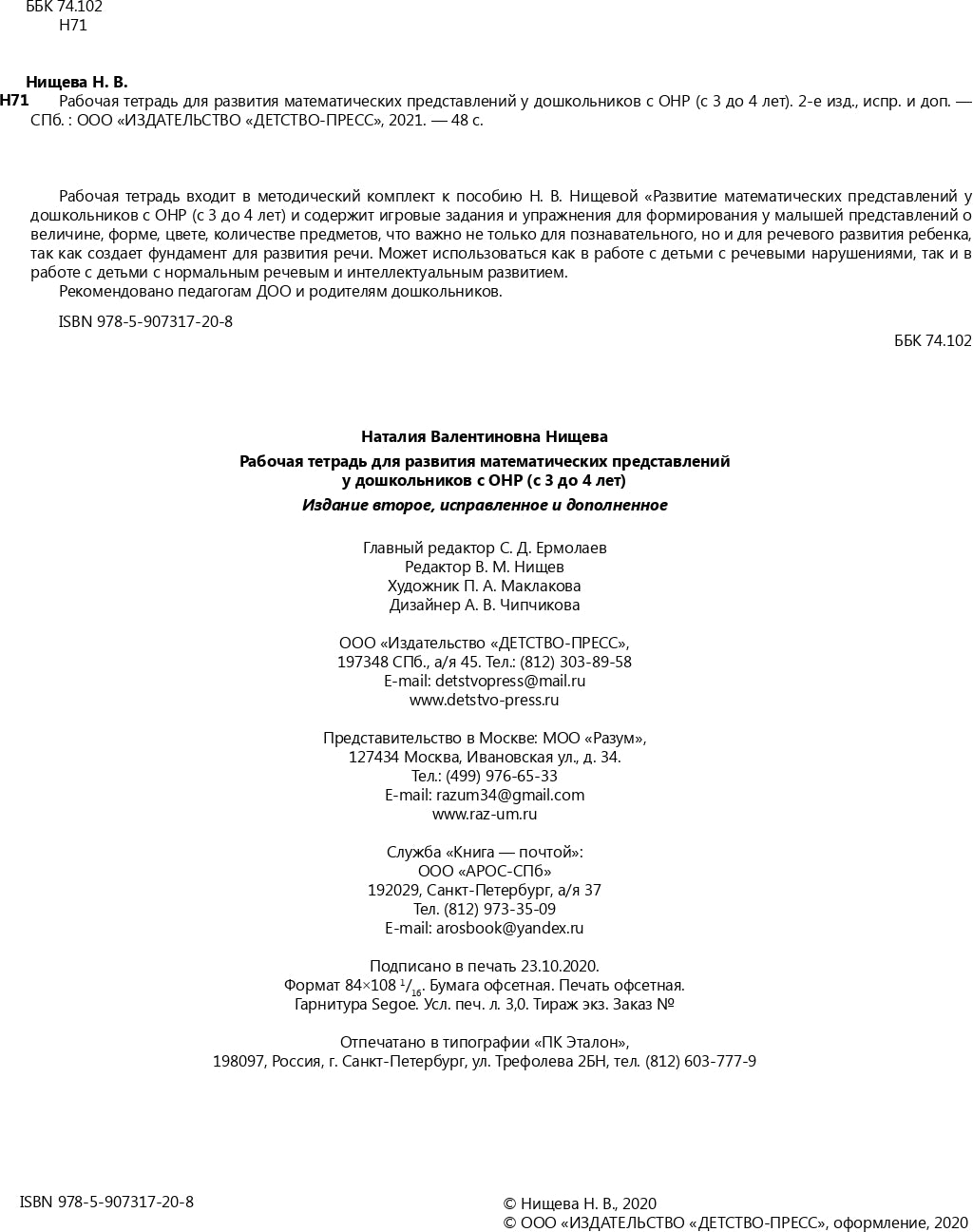 Рабочая тетрадь входит в методический комплект к пособию Н. В. Нищевой «Развитие математических представлений у дошкольников с ОНР (с 3 до 4 лет) и содержит игровые задания и упражнения для формирования у малышей представлений о величине, форме, цвете, количестве предметов, что важно не только для познавательного, но и для речевого развития ребенка, так как создает фундамент для развития речи. Может использоваться как в работе с детьми с речевыми нарушениями, так и в работе с детьми с нормальным речевым и интеллектуальным развитием.Рекомендовано педагогам ДОО и родителям дошкольников.2-е издание, исправленное и дополненное.