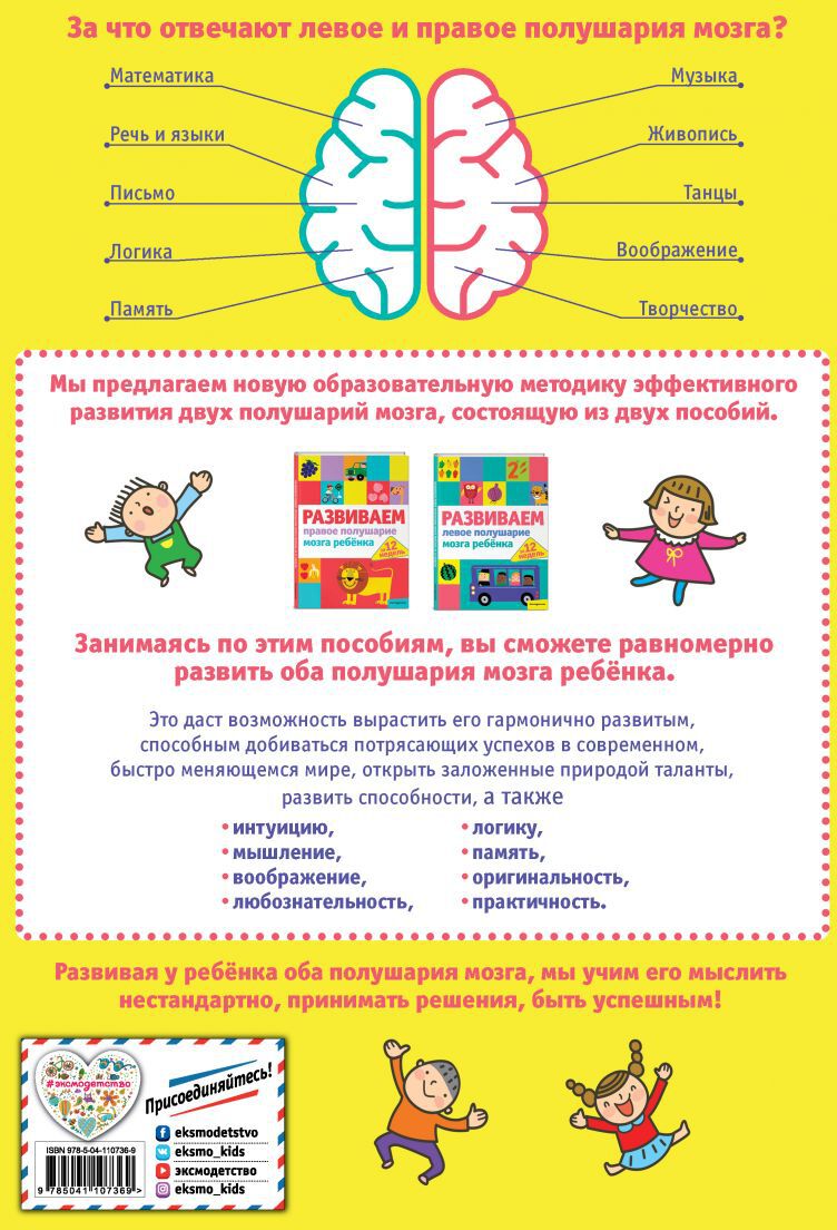 Правое и левое полушария мозга обеспечивают единую работу организма, но при этом каждое полушарие выполняет определённые задачи и отвечает за конкретные функции. Работа их взаимосвязана. Для формирования гармонично развитой личности необходимо уделять одинаковое внимание развитию двух полушарий мозга. Именно это является целью предлагаемой методики. Задача этого пособия — оказать родителям квалифицированную помощь в развитии правого полушария. Увлекательные игровые задания, рассчитанные на 12 недель занятий, помогут ребенку научиться правильно обрабатывать и воспринимать невербальную информацию, развить музыкальные, художественные, литературные способности, воображение и интуицию. В сочетании с пособием по развитию левого полушария мозга – развитие ребенка будет гармоничным. Адресовано любознательным дошкольникам и их заботливым родителям и может использоваться, как для индивидуальных занятий, так и в группах.