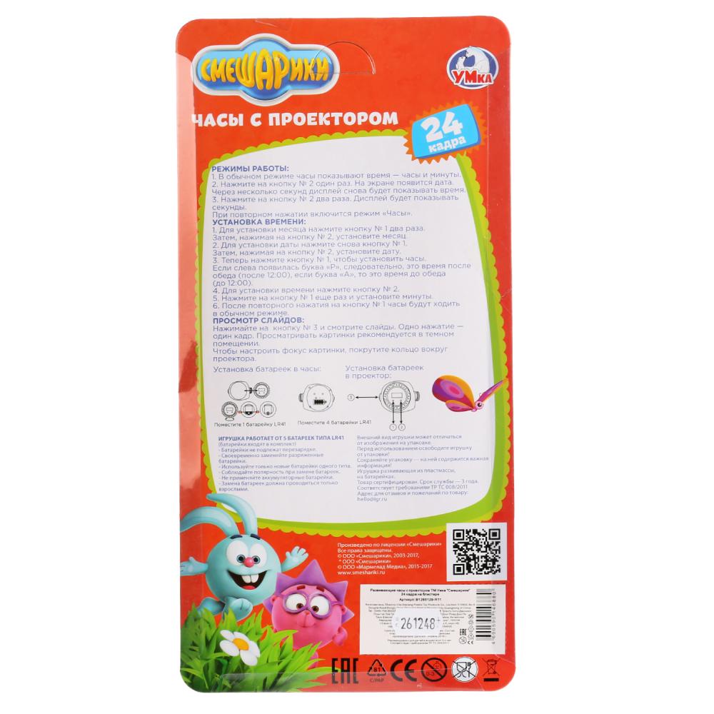Развивающие часы с проектором «Смешарики» ТМ «УМка» - отличный подарок для малыша. Они изготовлены из качественной пластмассы с металлическими элементами, украшены по мотивам любимого мультика. Часы показывают время, дату и секунды. В них встроен проектор с 24 кадрами из знаменитого мультфильма «Смешарики». Устройство развивает память, внимание, фантазию, мелкую моторику рук. Имеет сертификат соответствия качества РОСТЕСТ. Рекомендовано для детей с 3 лет. В комплекте батарейки LR41*4.
