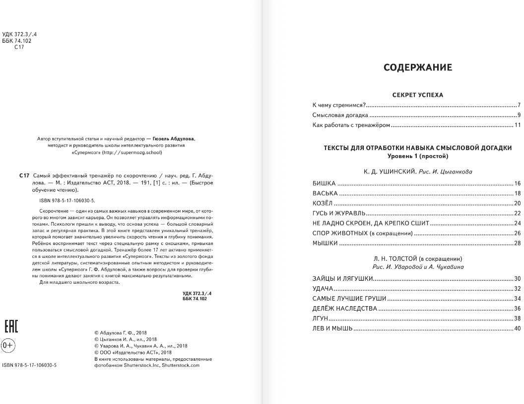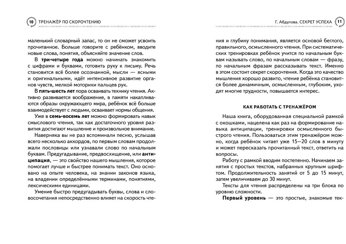 Скорочтение - один из самых важных навыков в современном мире, от которого во многом зависит карьера. Он позволяет управлять информационными потоками. Психологи пришли к выводу, что основа успеха - большой словарный запас и регулярная практика.В этой книге представлен уникальный тренажёр, который помогает значительно увеличить скорость чтения и глубину понимания. Ребёнок воспринимает текст через специальную рамку с окошками, привыкая пользоваться смысловой догадкой.Тренажёр более 17 лет активно применяется в школе интеллектуального развития "Супермозг". Тексты из золотого фонда детской литературы, систематизированные опытным методистом и руководителем школы "Супермозг" Г. Ф. Абдуловой, а также вопросы для проверки глубины понимания делают занятия с книгой максимально результативными.Для дошкольного и младшего школьного возраста.Научиться быстро читать совсем не сложно, главное - овладеть навыком смысловой догадки! Этот тренажёр превратит скучные занятия по отработке техники чтения в увлекательную игру. Накрываем текст рамкой с окошками и стараемся угадать, какие буквы за ней спрятались. Читайте быстрее, понимайте больше!
