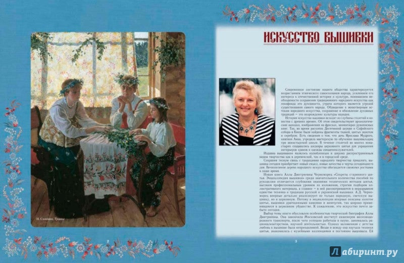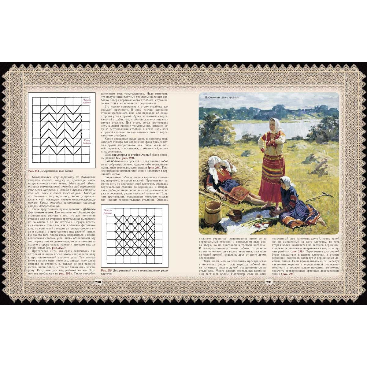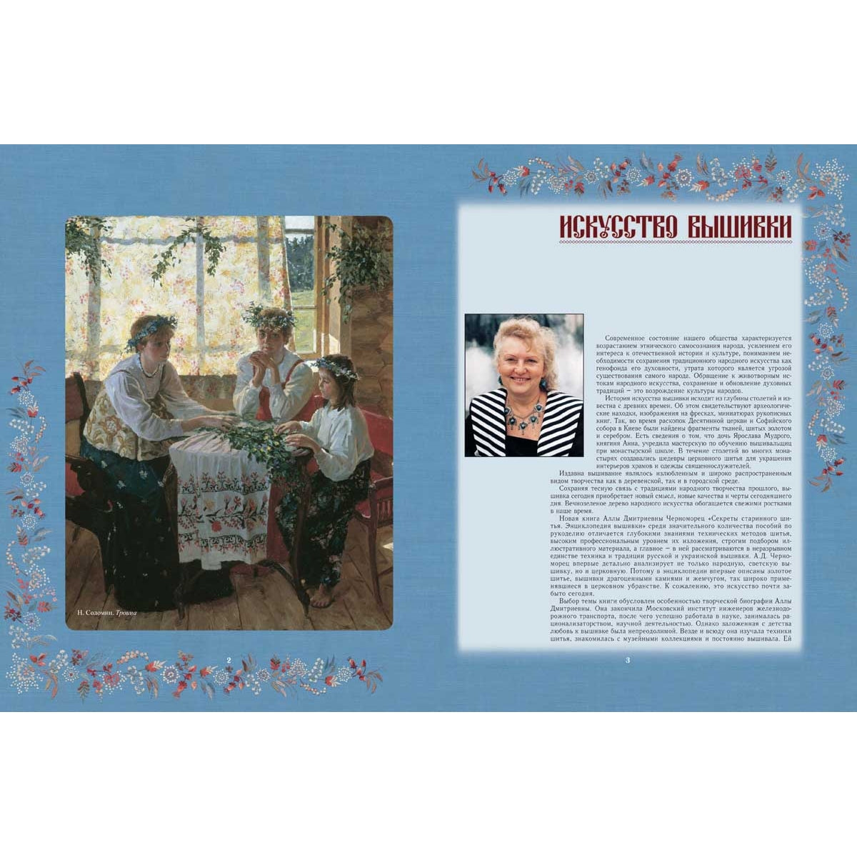 Новая книга народного мастера А.Д. Черноморец «Секреты старинного шитья. Энциклопедия вышивки» отличается глубокими знаниями автора технических методов шитья, высоким профессиональным уровнем изложения материала, уникальным подбором иллюстраций. В книге детально анализируются не только приемы народной вышивки, игольного кружева, но и образцы церковного рукоделия. В энциклопедии впервые описано почти забытое сегодня искусство золотого шитья и вышивки драгоценными камнями и жемчугом, так широко применявшееся в церковном убранстве.