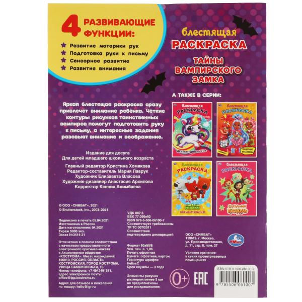 Блестящая раскраска «Тайны вампирского замка» ТМ «УМка» - отличный подарок для юных художников:- тщательно прорисованные картинки для раскрашивания- короткие комментарии к каждой иллюстрации- красивая обложка, украшенная блёстками- необычные персонажи