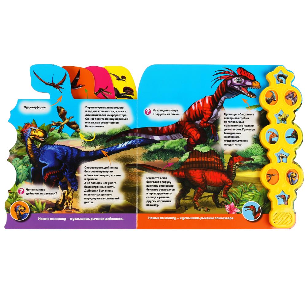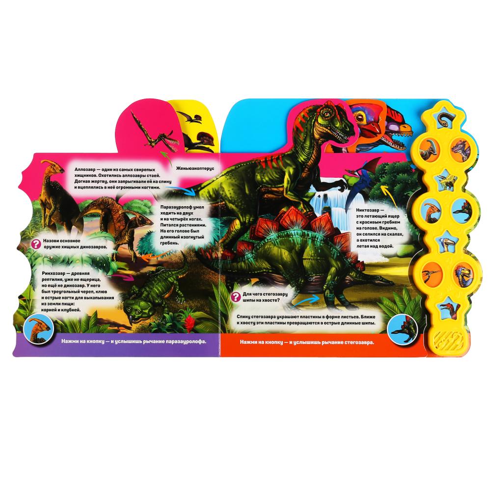 Энциклопедия познакомит ребёнка с динозаврам, а звуковые кнопки озвучат голоса древних животных. Одно нажатие на кнопку – включится звук, второе нажатие – выключится.