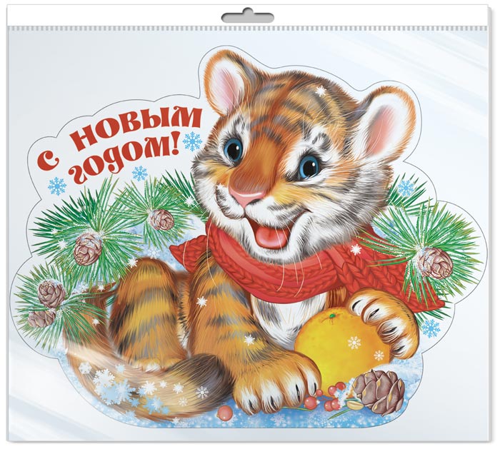 *Ф-13929 ПЛАКАТ ВЫРУБНОЙ А3 В ПАКЕТЕ. Тигренок новогодний - группа Животные (блестки в лаке, в индивидуальной упаковке, с европодвесом и клеевым клапаном)