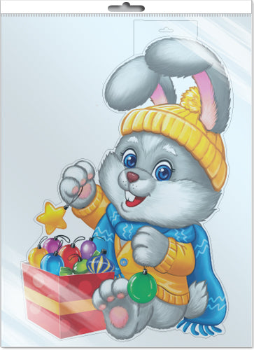 *Ф-16582 ПЛАКАТ ВЫРУБНОЙ А3 В ПАКЕТЕ. Зайчик с новогодними игрушками (двухсторонний, ВД-лак, в индивидуальной упаковке, с европодвесом и клеевым клапаном)