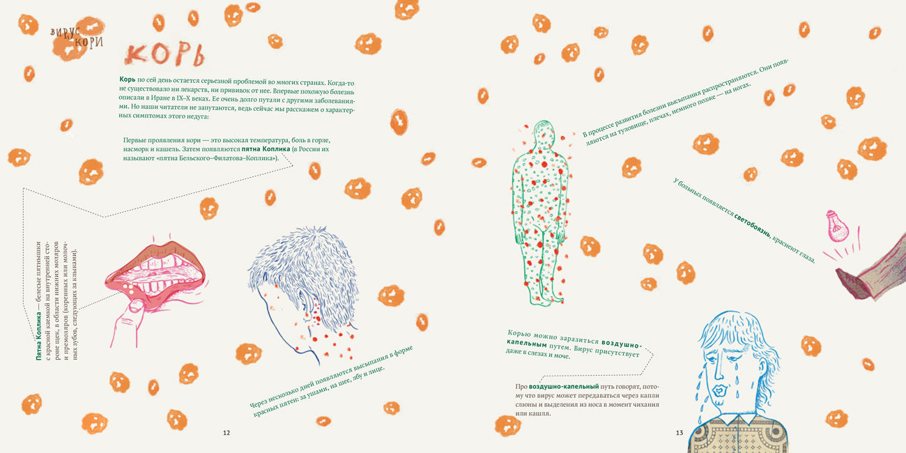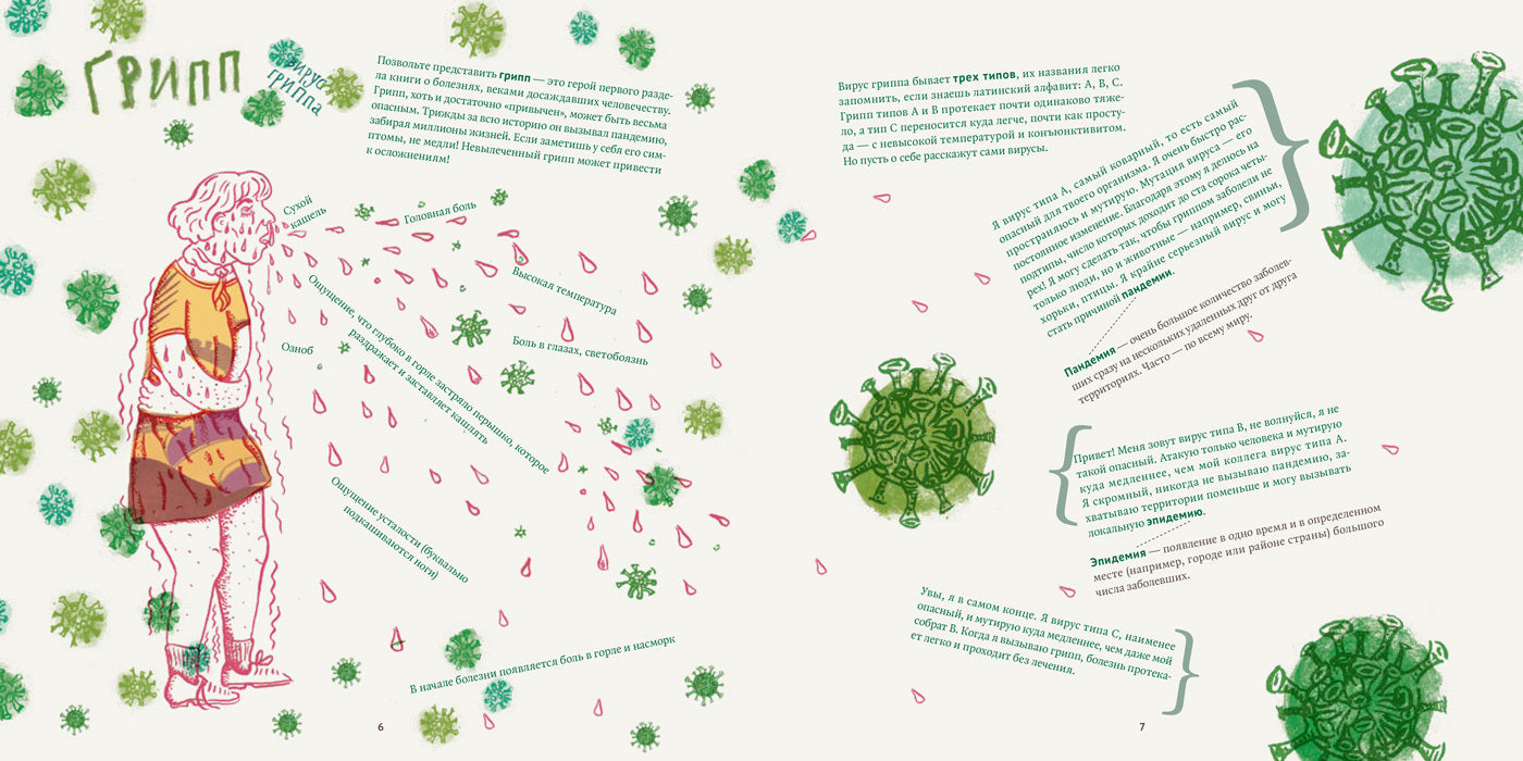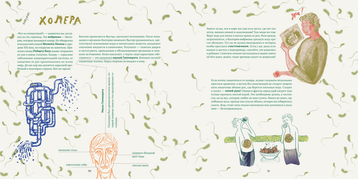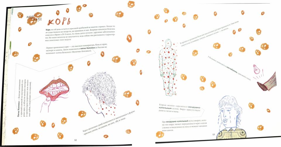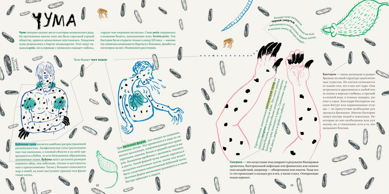 Книга для детей о болезнях — вот странная идея! А ведь отлично проиллюстрированные и полные иронии описания самых известных болезней не только дают солидную порцию практических знаний, но и здóрово развлекают.Книга не претендует на то, чтобы быть полноценным серьезным справочником. Как раз наоборот. В ироничном повествовании переплелись реалии минувших эпох, суеверия и странные для современного человека культурные обычаи, ошибки и удачи ученых. Создатели книги — автор Томек Жарнецкий и художница Гося Кулик — известны в Польше как популяризаторы науки, они пишут именно для детской аудитории. Поэтому даже самые страшные болезни и их последствия представлены здесь так, что у читателя не возникает ни страха, ни отвращения. При этом в тексте четко прослеживается важный посыл о роли гигиены в жизни человека (и человечества).Похожи ли вирусы на зомби? Можно ли полюбить вшей? Кто придумал использовать болезни в качестве оружия? Зачем «чумному доктору» клюв? Как полиомиелит помог поймать Усаму бен Ладена? На эти и многие другие вопросы можно найти ответ в этой книге.Вкратце:- Задорная, познавательная и совершенно не страшная книга о пятнадцати самых известных вирусах.- Современные, даже немного хулиганские иллюстрации не оставят равнодушными ни детей, но взрослых.- Информация проверена научным редактором, известным популяризатором науки Алексеем Паевским.Для кого:Для детей от 10 лет и их родителей.Эта книга вышла при поддержке Политехнического музея. Политех – музей про человека и мир вокруг него, музей о том, что мы уже знаем, о том, что исследуем прямо сейчас, о том, что узнаем завтра. Мы делаем всё, чтобы встреча человека и науки состоялась. Чтобы она была интригующей. Чтобы наука осталась в жизни человека навсегда. Чтобы просвещение стало нашим общим будущим. Об авторах:Томек Жарнецкий (р. 1975) окончил факультет культурологии во Вроцлавском университете, имеет степень бакалавра в области преподавания художественных дисциплин. Томек организует выставки театральных плакатов, проводит художественные и театральные мастерские. Он автор множества научно-популярных текстов для молодежи о живописи, истории, антропологии. Любимые виды искусства — театр и графика.Гося Кулик (р. 1985) окончила Академию художеств в Катовицах, защитила диплом по книжной графике. Сфера творческих интересов — книжная иллюстрация, графический роман, живопись. В ее книгах текст и изображения представляют собой единое целое, ироничное и порой парадоксальное повествование. Работы Госи отмечены десятком престижных польских премий в области детской литературы.