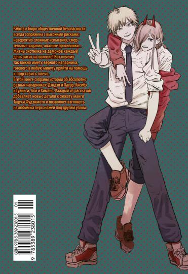 Работа в Бюро общественной безопасности всегда сопряжена с высокими рисками: невероятно сложные испытания, смертельные задания, опасные противники... Жизнь охотника на демонов каждый день висит на волоске! Вот почему так важно иметь верного напарника, готового в любую минуту прийти на помощь и подставить плечо.В этой книге собраны истории об абсолютно разных напарниках: Дэндзи и Пауэр, Кисибэ и Гуаньси, Аки и Химэно. Каждый из рассказов добавляет новые детали к сюжету манги Тацуки Фудзимото и позволяет взглянуть на любимых персонажей под другим углом. Пять причин купить 1«Человек-бензопила. Истории о напарниках» – сборник из четырёх историй, дополняющих сюжет оригинальной манги. 2Тексты Сакаку Хисикавы в книге сопровождаются иллюстрациями автора оригинальной манги – Тацуки Фудзимото. 3Помимо внутренних иллюстраций в книгу включена двусторонняя раскладная цветная вклейка. 4Прекрасное дополнение к самой популярной манге в России 2022 года. 5Этого не было в манге!