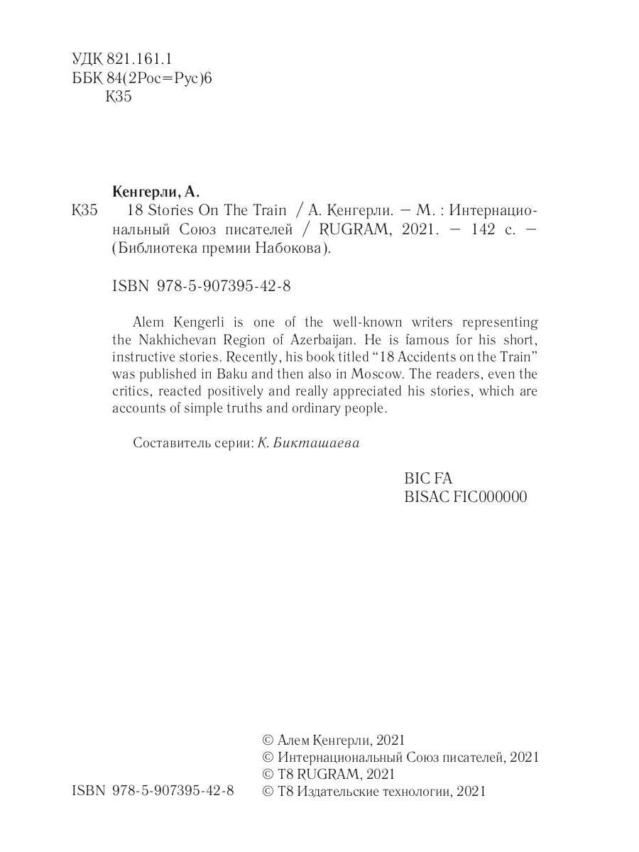 Автор: Кенгерли А., «18 Stories On The Train»: Alem Kengerli is one of the well-known writers representing the Nakhichevan Region of Azerba? an. He is famous for his short, instructive stories. Recently, his book titled “18 Accidents on the Train” was published in Baku and then also in Moscow. The readers, even the critics, reacted positively and really appreciated his stories, which are accounts of simple truths and ordinary people.