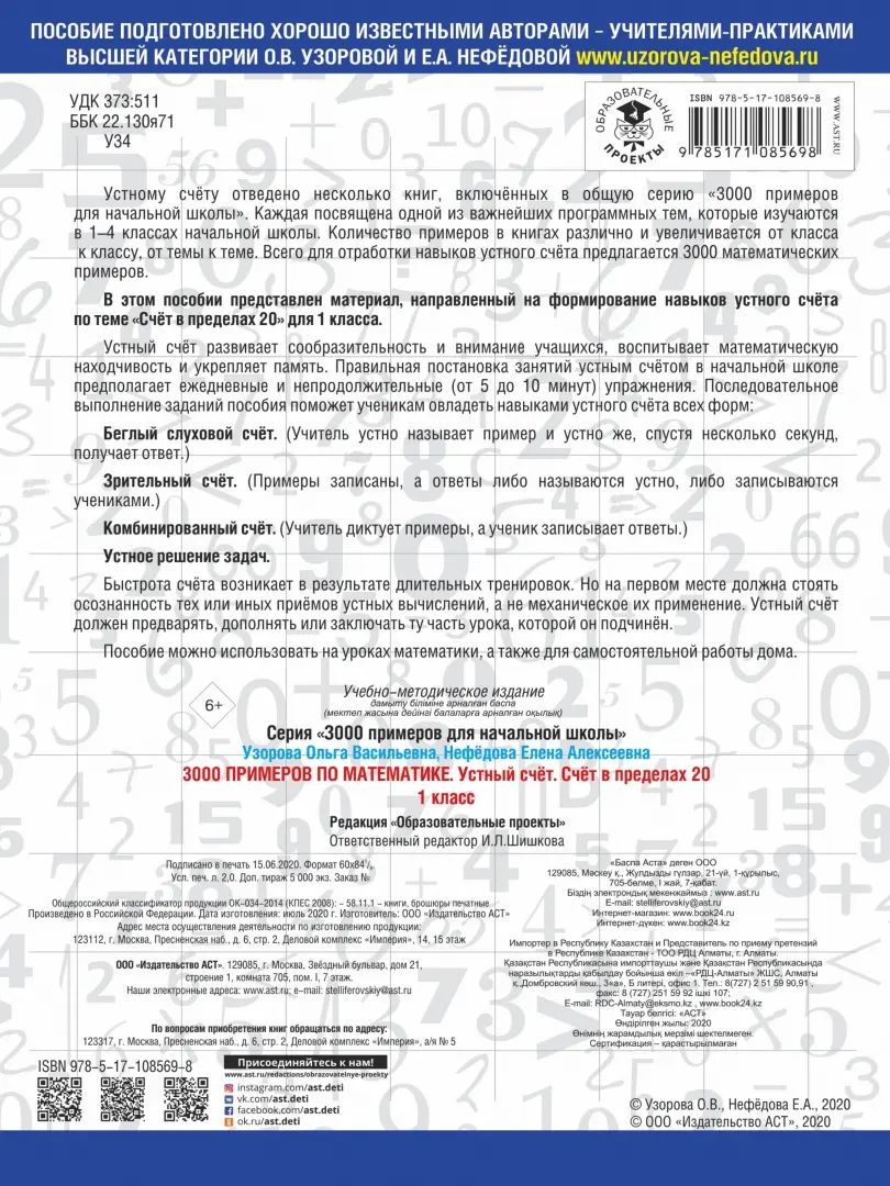 Устному счету отведено несколько книг, включенных в общую серию "3000 примеров по математике". Каждая посвящена одной из важнейших программных тем, которые изучаются в 1-4 классах начальной школы. Количество примеров в книгах различно и увеличивается от класса к классу, от темы к теме. Всего для отработки навыков устного счета предлагается 3000 математических примеров.В этом пособии представлен материал, направленный на формирование навыков устного счета по теме "Счет в пределах 20" для 1 класса.Устный счет развивает сообразительность и внимание учащихся, воспитывает математическую находчивость и укрепляет память. Правильная постановка занятий устным счетом в начальной школе предполагает ежедневные и непродолжительные (от 5 до 10 минут) упражнения. Последовательное выполнение заданий пособия поможет ученикам овладеть навыками устного счета всех форм:Беглый слуховой счет. (Учитель устно называет пример и устно же, спустя несколько секунд, получает ответ.)Зрительный счет. (Примеры записаны, а ответы называются либо устно, либо записываются учениками.)Комбинированный счет. (Учитель диктует примеры, а ученик записывает ответы.) Устное решение задач.Быстрота счета возникает в результате длительных тренировок. Но на первом месте должна стоять осознанность тех или иных приемов устных вычислений, а не механическое их применение. Устный счет должен предварять, дополнять или заключать ту часть урока, которой он подчинен.Пособие можно использовать на уроках математики, а также для самостоятельной работы дома.В книге известных педагогов-практиков, авторов самых издаваемых учебников и учебных пособий в России О.В. Узоровой и Е.А. Нефёдовой представлен материал, направленный на формирование навыков устного счета по теме «Счет в пределах 20» для 1 класса.Последовательное выполнение заданий пособия поможет ученикам овладеть навыками устного счета всех форм, разовьет у них сообразительность, внимание и математическую находчивость.Пособие можно использовать на уроках в школе, а также для самостоятельных занятий дома.