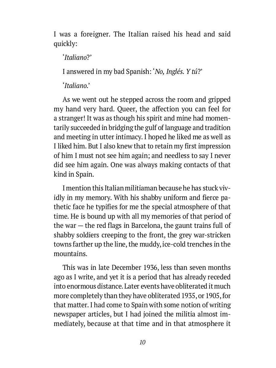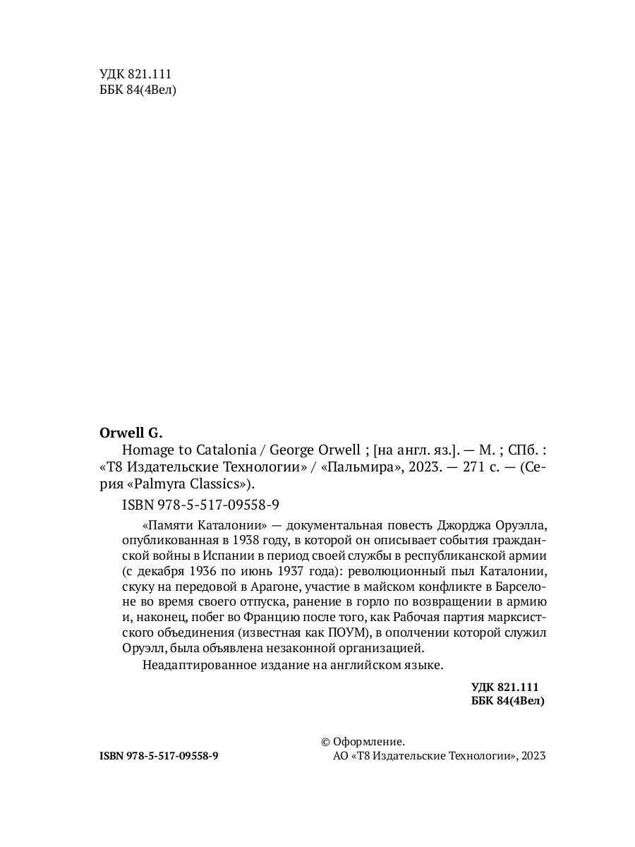 Автор: Оруэлл Дж., «Homage to Catalonia»: "Памяти Каталонии" - документальная повесть Джорджа Оруэлла, опубликованная в 1938 году, в которой он описывает события гражданской войны в Испании в период своей службы в республиканской армии (с декабря 1936 по июнь 1937 года): революционный пыл Каталонии, скуку на передовой в Арагоне, участие в майском конфликте в Барселоне во время своего отпуска, ранение в горло по возвращении в армию и, наконец, побег во Францию после того, как Рабочая партия марксистского объединения (известная как ПОУМ), в ополчении которой служил Оруэлл, была объявлена незаконной организацией. Неадаптированное издание на английском языке.