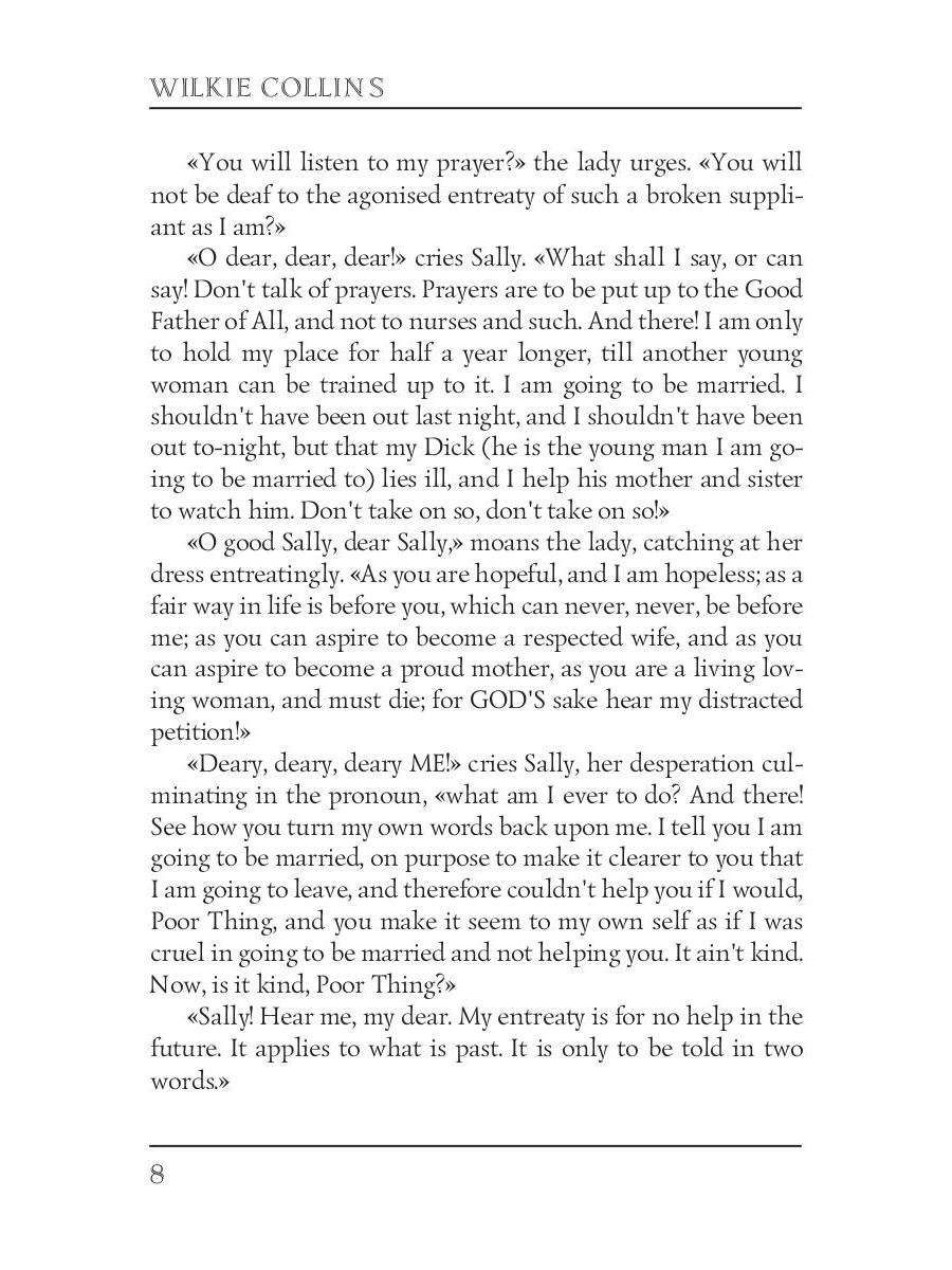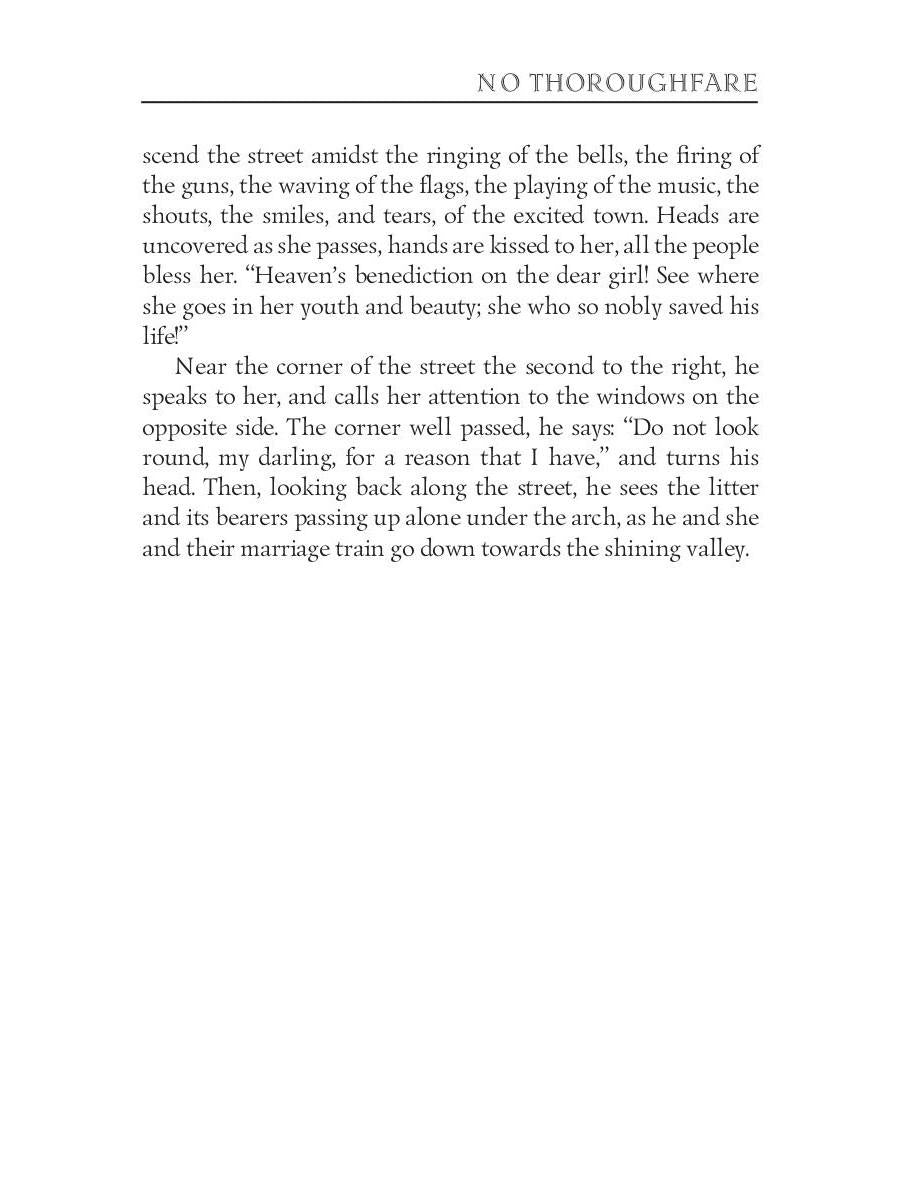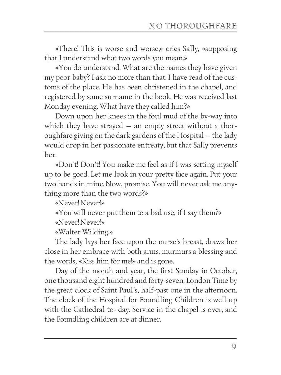 Автор: Collins William Wilkie, «No Thoroughfare = В тупике (роман на английском языке)»: In 1867 Charles Dickens and Wilkie Collins collaborated to produce a stage play titled No Thoroughfare: A Drama: In Five Acts. Two boys from the Foundling Hospital are given the same name, (Walter Wilding), with disastrous consequences in adulthood. After the death of one - now a proprietor of a wine merchant's company - the executors, to right the wrong, are commissioned to find a missing heir. Their quest takes them from wine cellars in the City of London to the sunshine of the Mediterranean - across the Alps in winter. Danger and treachery would prevail were it not for the courage of the heroine, Marguerite, and a faithful company servant.