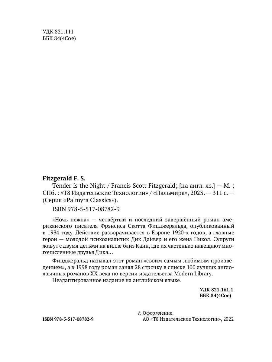 Автор: Fitzgerald F. S., «Tender Is the Night: на англ., яз»: Francis Scott Key Fitzgerald. (1896–1940) - а famous American novelist and short story writer. F. Scott Fitzgerald is regarded as one of the greatest twentieth century writers from the so-called "Lost Generation". He finished four novels, left a fifth unfinished, and wrote dozens of short stories that treat themes of youth, promise, age, and despair. Tender is the Night (1934), tells the story of the rise and fall of Dick Diver, a promising young psychoanalyst, and his wife, Nicole, who is also one of his patients. The early 1930s, when Fitzgerald worked on the book, were the darkest years of his life, and the novel's bleakness reflects the author’s own experiences.