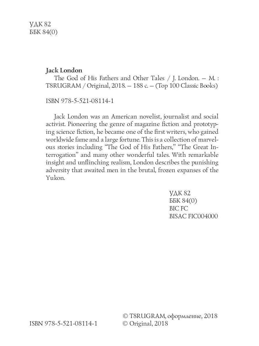 Автор: London Jack, «The God of His Fathers and Other Tales = Бог его отцов и другие рассказы (на английском языке)»: Jack London was an American novelist, journalist and social activist. Pioneering the genre of magazine fiction and prototyping science fiction, he became one of the first writers, who gained worldwide fame and a large fortune. This is a collection of marvelous stories including "The God of His Fathers," "The Great Interrogation" and many other wonderful tales. With remarkable insight and unflinching realism, London describes the punishing adversity that awaited men in the brutal, frozen expanses of the Yukon.