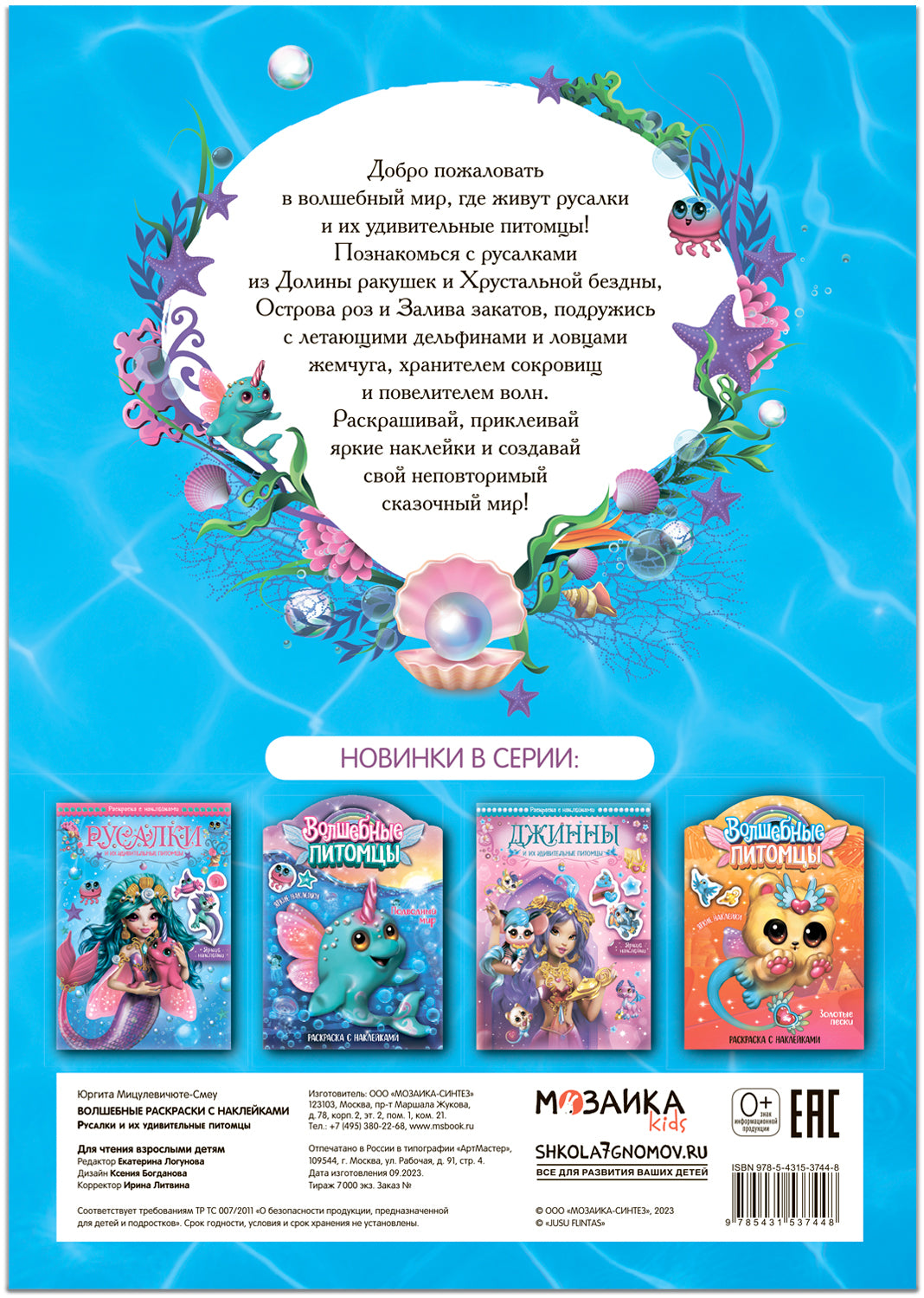 Русалки и их удивительные питомцы (Волшебные раскраски с наклейками) Знакомьтесь — русалка Залива закатов и ее преданный летающий дельфин, рядом с ней русалка Долины ракушек и ее друзья — ловцы жемчуга. А еще русалка Хрустальной бездны и радужная русалка со своими необычными питомцами… В книге «Русалки и их удивительные питомцы» серии «Волшебные раскраски с наклейками» ребенок будет увлеченно раскрашивать новых героев, включая фантазию и воображение, и приклеивать яркие наклейки на страницы книги, делая сказочный мир уютнее и наряднее. За такими...