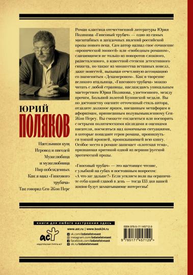 Роман классика отечественной литературы Юрия Полякова «Гипсовый трубач» – одно из самых масштабных и загадочных явлений российской прозы нового века. Сам автор назвал свое сочинение «иронической эпопеей» или «свободным романом», слагающимся не только из поворотов сложного, разветвленного, в известной степени детективного сюжета, но также из множества вставных новелл, повестей, вызывая отчетливую ассоциацию со знаменитым «Декамероном». Как и творение великого итальянца, «Гипсового трубача» можно читать с любой страницы, наслаждаясь уникальным мастерством Юрия Полякова, удостоенного Большой золотой Бунинской медали. Вы по достоинству оцените отточенный стиль автора, отдадите должное ярким, внезапным метафорам и афоризмам, приписанным полувымышленному Сен-Жон Персу. Вы сможете согласиться или поспорить с острыми политическими взглядами и оценками писателя, посмеяться над комичными ситуациями, в которые попадают герои романа, проникнуться тонкой иронией, пронизывающей всю книгу. Особое место в романе занимает «плотская тема», признанная критикой одной из вершин русской эротической прозы.